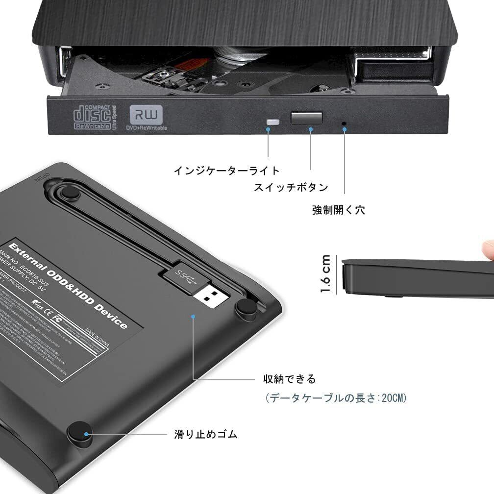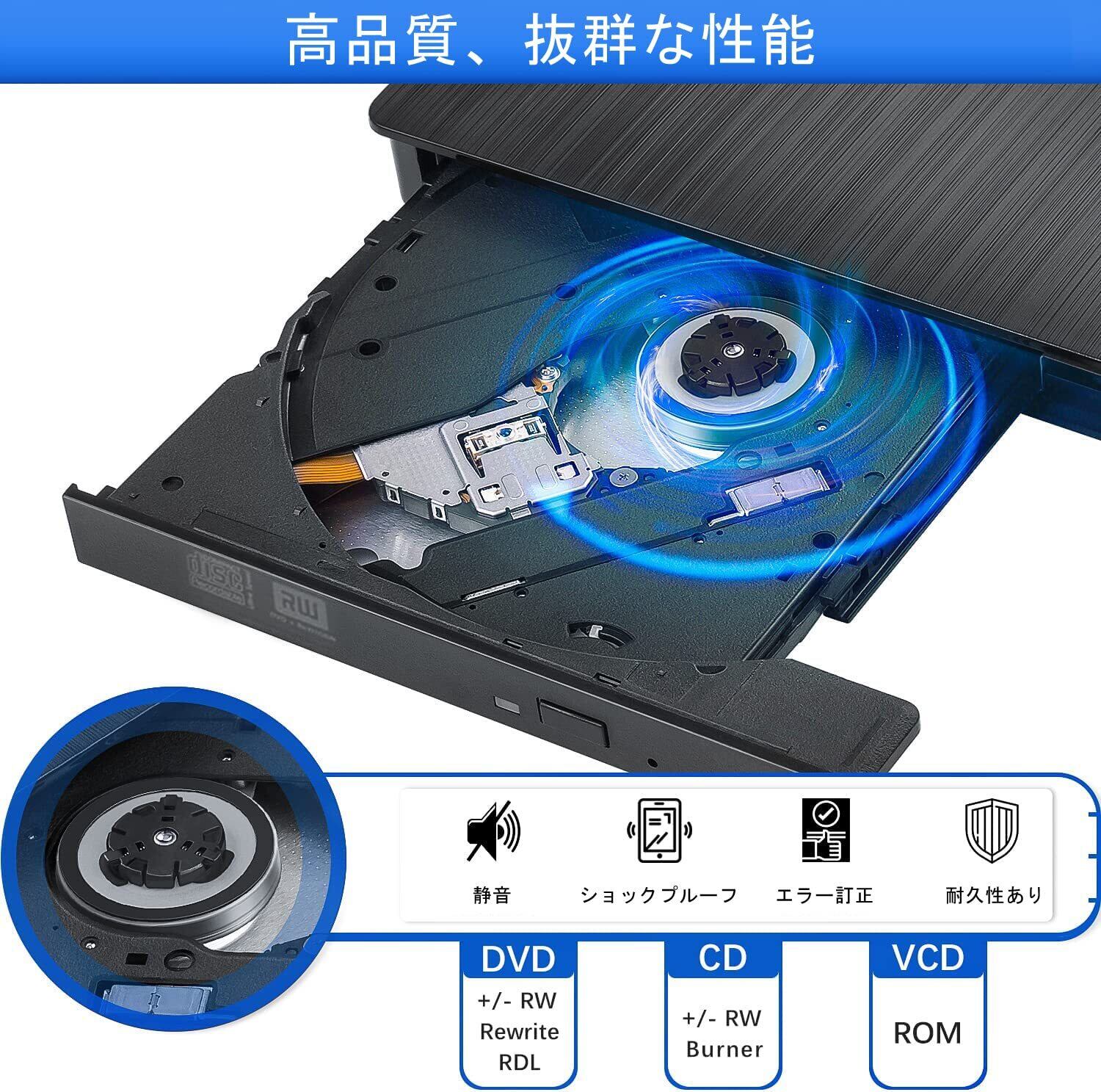 外付けdvdドライブ USB 3.0 type-c CD/DVD読込み・録画込み・書込 CD/DVDプレーヤー 外付け光学ドライブ 外付CD・DVDドライブ PC外付けドライブ ポータブルドライブ CD/DVDドライブ ノートパソコン DVD±RW CD-RW USB3.0/2.0 高速 静音 超スリム 薄型 コンパクト Window/Linux/Mac OS対応 (ブラック)