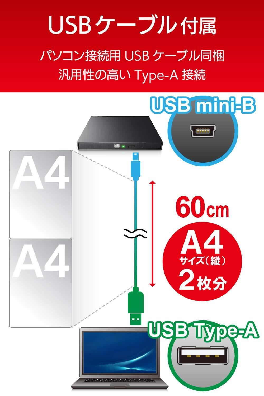 ■ 60㎝のUSBケーブルを標準付属し、パソコンとドライブの接続/設置の際に取り回しが便利。