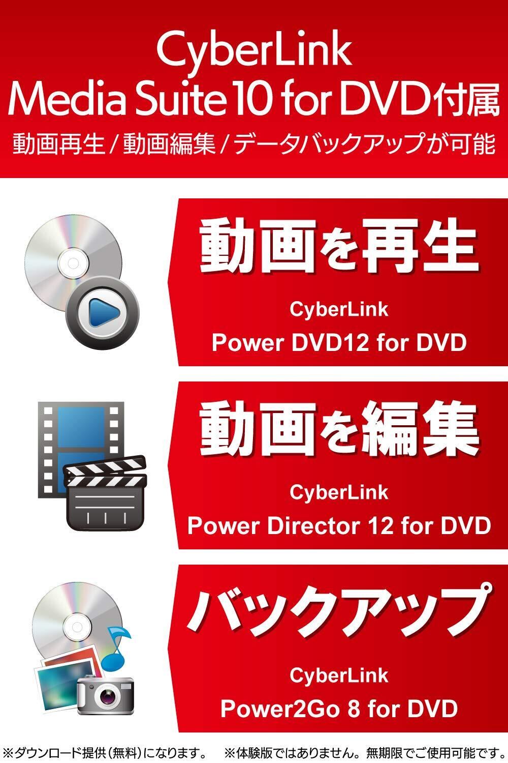 ■ 動画再生、動画編集、データバックアップのオールインワンソフトを標準で製品に付属。※期間限定の体験版ではございません。