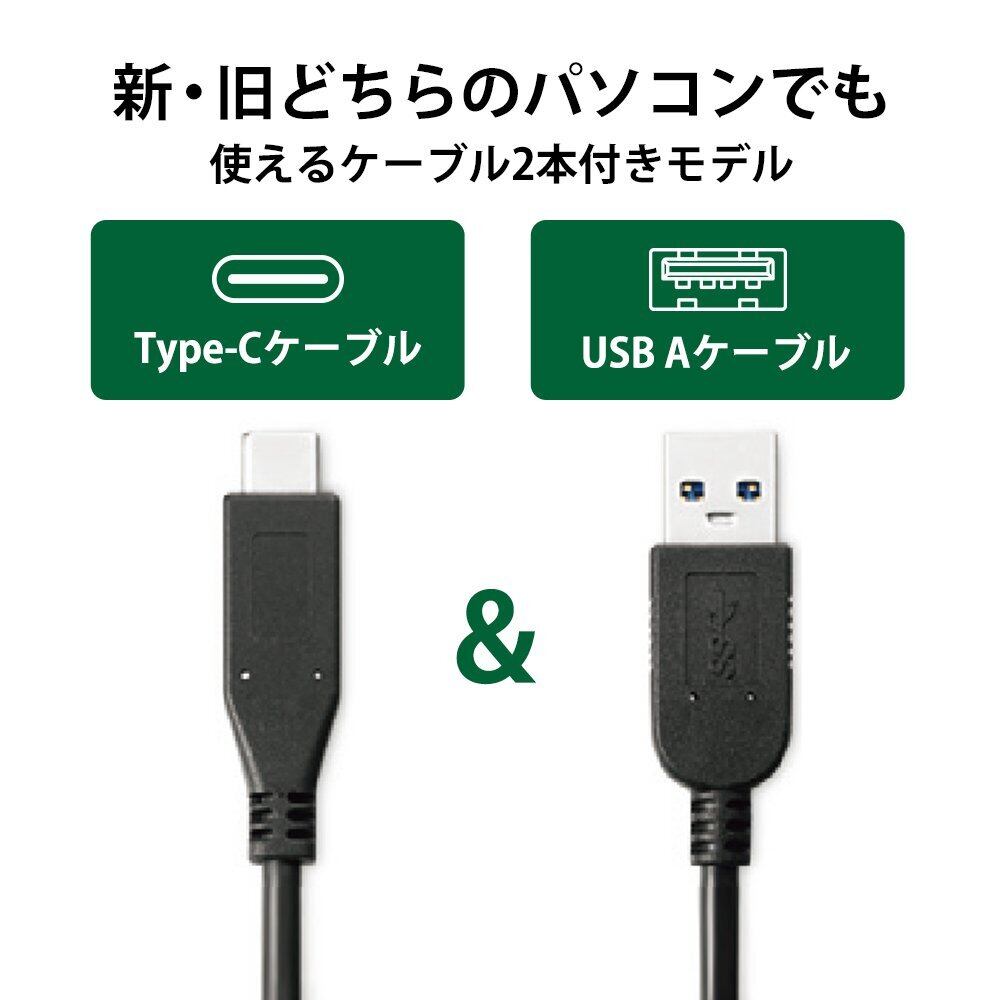 ■本商品は、USB Type-Cコネクターに対応。新型MacBookなどのUSB Type-Cコネクターを搭載したパソコン等でご利用いただけます。またUSB Aコネクター用のケーブルも同梱していますので、従来のパソコンでもご利用いただけます。
