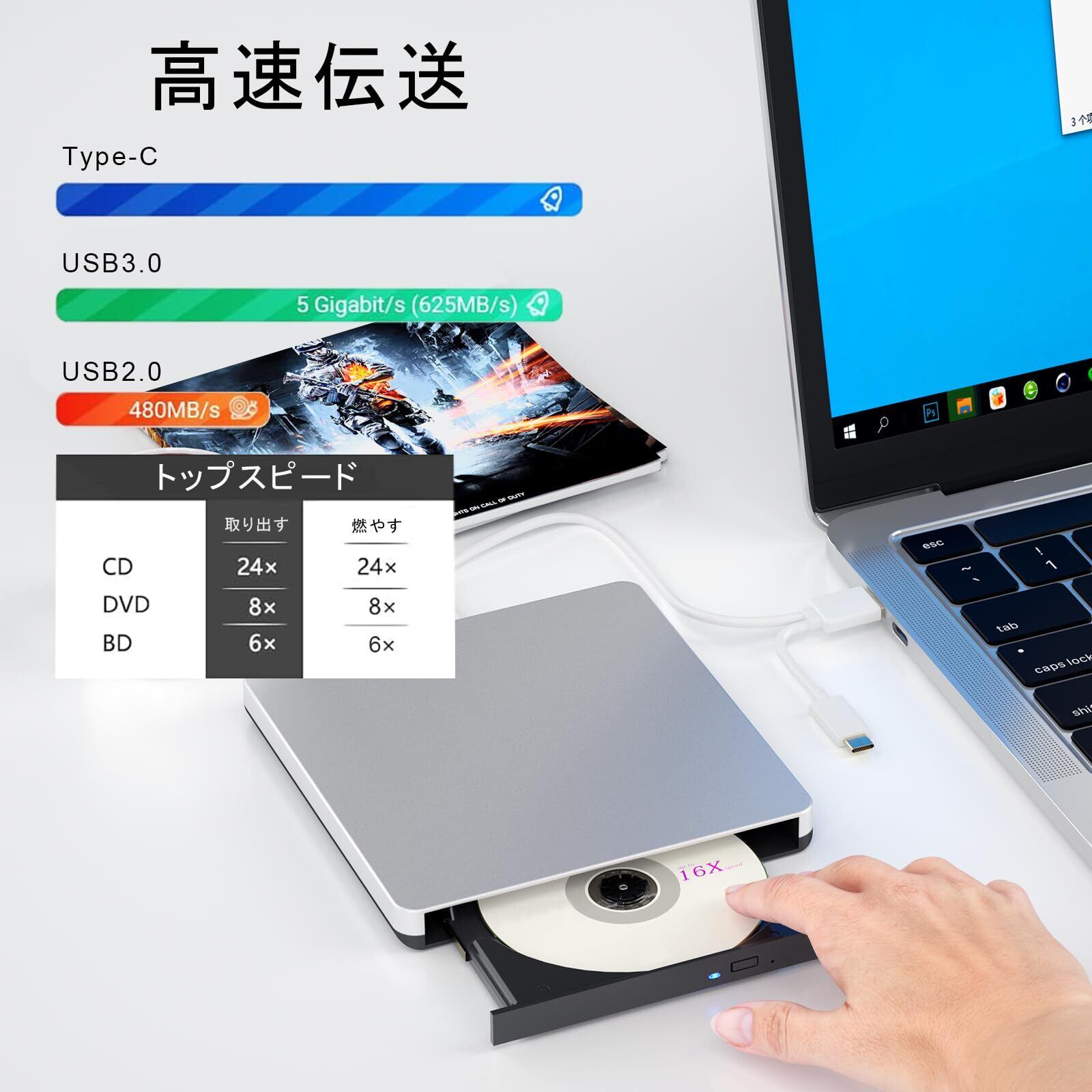 ブルーレイドライブ外付け blu-rayプレイヤー再生読み書usb-aと (type-c) 外付けブルーレイ ドライブ ブルーレイディスク対応WIN7-11/MAC対応 ノートパソコン対応(silver)