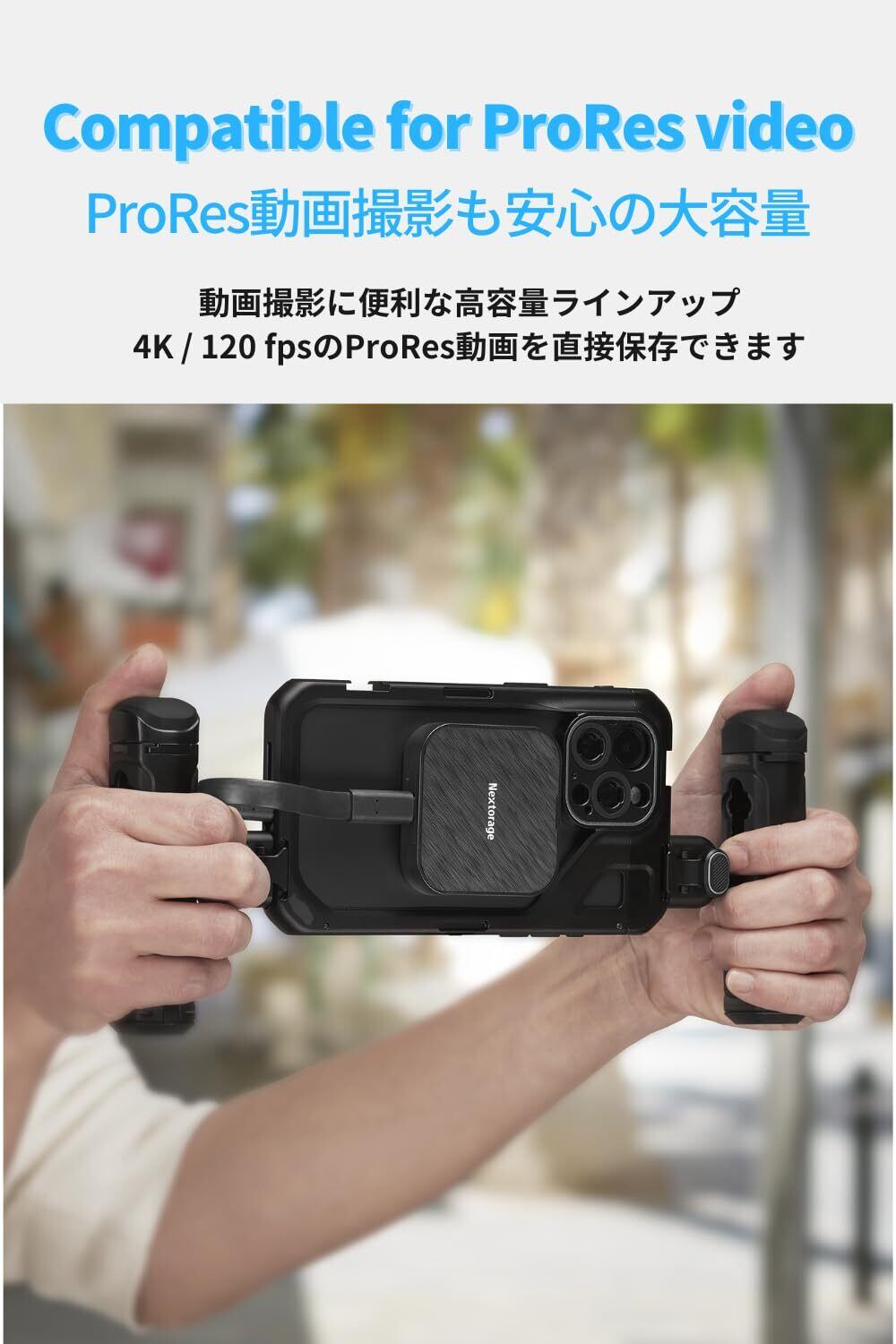 iPhone 15, 16 Pro/Pro MAXは、大容量のProRes形式動画を外部HDDやSSDへ直接録画可能です。特に4K/120fps, 4K/60fpsの動画撮影を行う際は外部ストレージの接続が必須となります。このSSDを使用することで、高画質な4K映像の撮影をスムーズに楽しめ、容量の大きくなる4K/120fps, 4K/60fps撮影もストレージ残量を気にせず行えます。