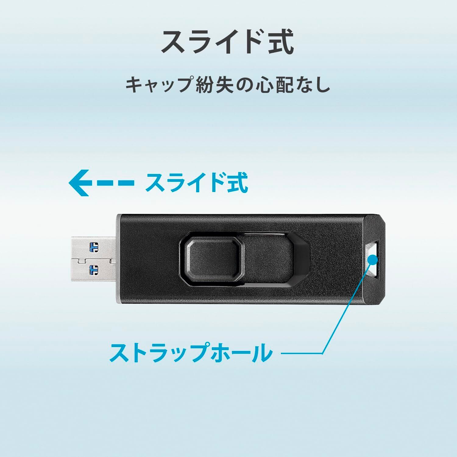 【スライド式だから、キャップ紛失の心配なし!】約23.5×68.8mmと、USBメモリー同等の小型サイズ。スライド式のため、キャップ紛失の心配もありません。また、ストラップホールも付いているので無くさないようにカバン等につけることも可能です。