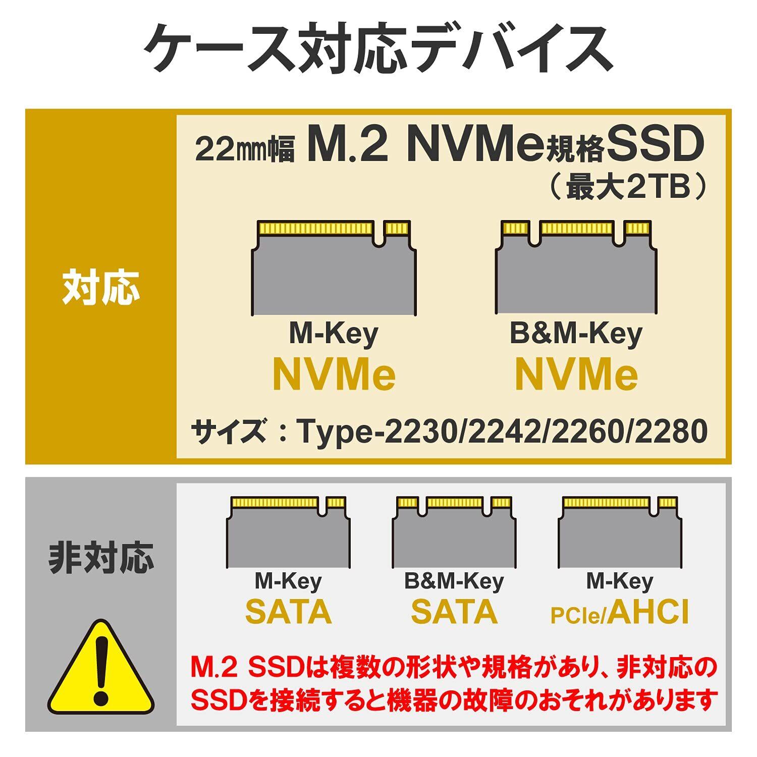 ■高速データ転送規格NVMeに対応しておりますので、USB3.2 Gen2の性能を最大限発揮できます。 ■完全スクリューレス設計となっており、ネジや工具を一切使わないカンタン装着が可能です。 ■対応パソコン:USBポートを搭載したWindowsパソコンおよびMacシリーズ ■対応OS(USB3.2 Gen2接続時):Windows8.1(32/64bit)・Windows10(32/64bit)・macOS Mojave 10.14 ・macOS Catalina 10.15 ・macOS Big Sur11 ■インターフェース:USB3.2(Gen2、Gen1)/USB3.1(Gen2、Gen1)/USB3.0/USB2.0 ■コネクタ形状:USB3.2 USB Type-C ■設置方向:水平