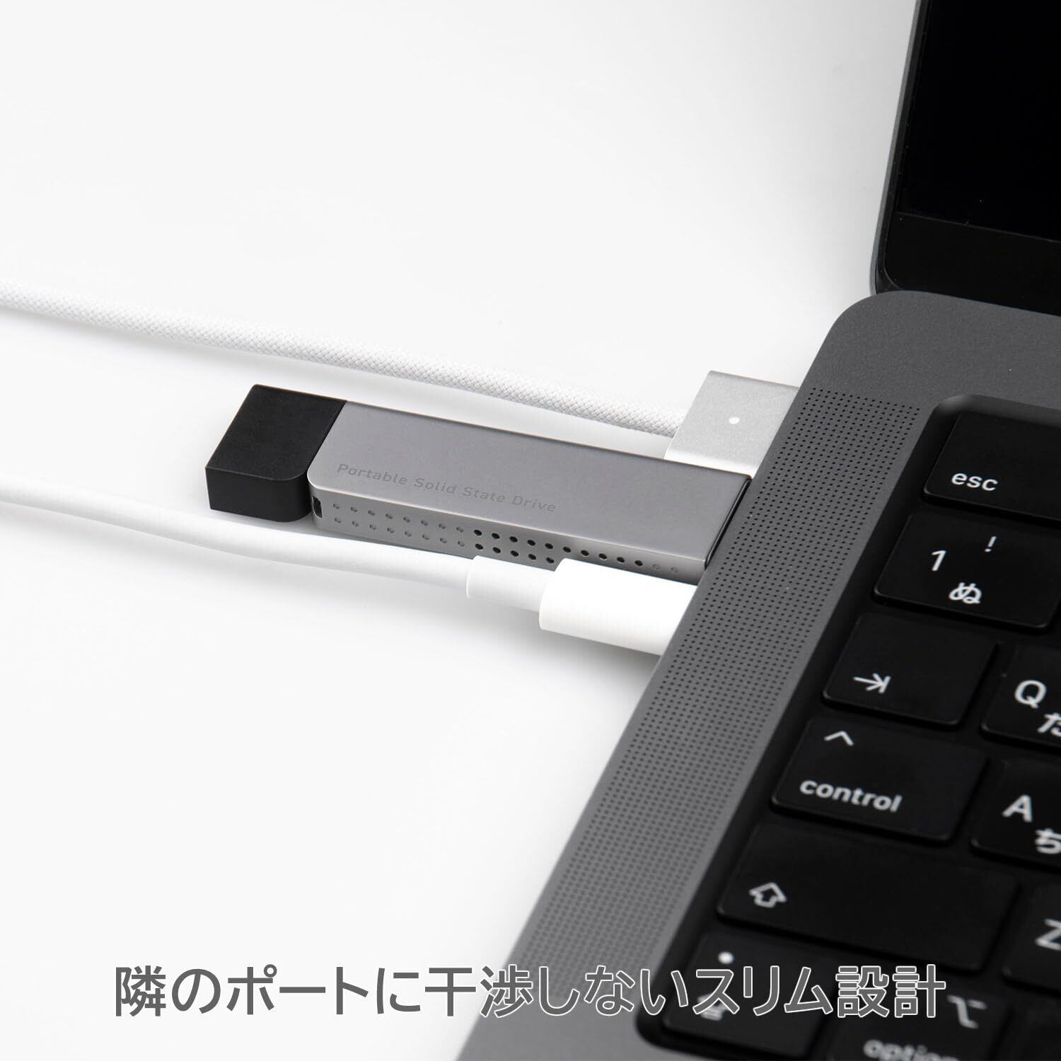 【隣のポートに干渉しないスリム設計】薄くてスリムなUSB Type-C 対応の スティック型 外付けSSD です。USBポート同士の距離が近い ノートパソコン や USBハブ などで、 USBデバイス を複数使用するときに便利です。外付けSSDを長時間挿したまま使う場合も、隣にACアダプタを接続して パソコン を充電しながら使うことができます。 ※隣がType-Cポートの場合、干渉しないコネクタ幅は約12.2mm以内となります。使用するパソコンやデバイスにより異なります。