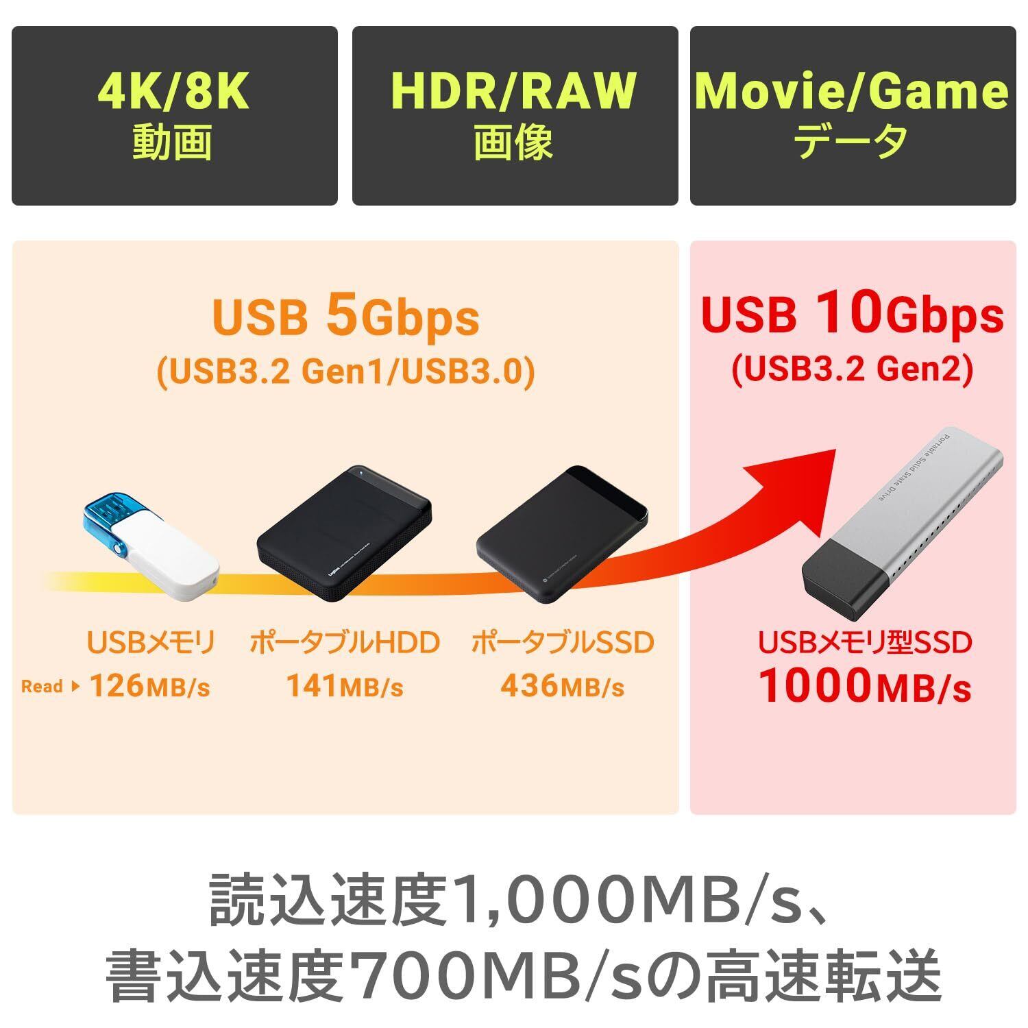 【読込速度1,000MB/s、書込速度700MB/sの高速転送】高速な内蔵SSDを採用したことで、読み込み最大1,000MB/s、書き込み最大700MB/sを実現。USB 10Gbps(USB3.2 Gen2)の性能を最大限発揮することができ、大量の画像ファイルや4K動画などの大容量ファイルをストレスなく転送できます。 Windows 、 Mac パソコン の他にゲーム機にもお使いいただけます。 ※USB 10Gbps(USB3.2 Gen2)の性能を発揮するには、PC側もUSB 10Gbps(USB3.2 Gen2)転送に対応している必要があります。 ※USB 5Gbps(USB3.2[Gen1]/USB3.1[Gen1]/USB3.0])に接続した場合、転送速度は5Gbps(理論値)となります。 ※USB2.0に接続した場合、転送速度は480MB/s(理論値)となります。