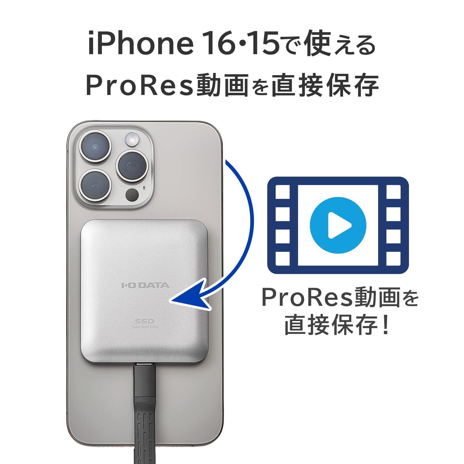 【iPhone 16・15で使える! ProRes動画を直接保存】iPhone 16/15 Pro/Pro MAXでは、大容量なProResコーデックの動画を外付けHDDやSSDに直接録画することが可能です。また、iPhone 16やiPhone 15での4K/60fps動画撮影には外部ストレージの接続が必要となります。本商品を接続し、高精細な4K動画の撮影を楽しみましょう。