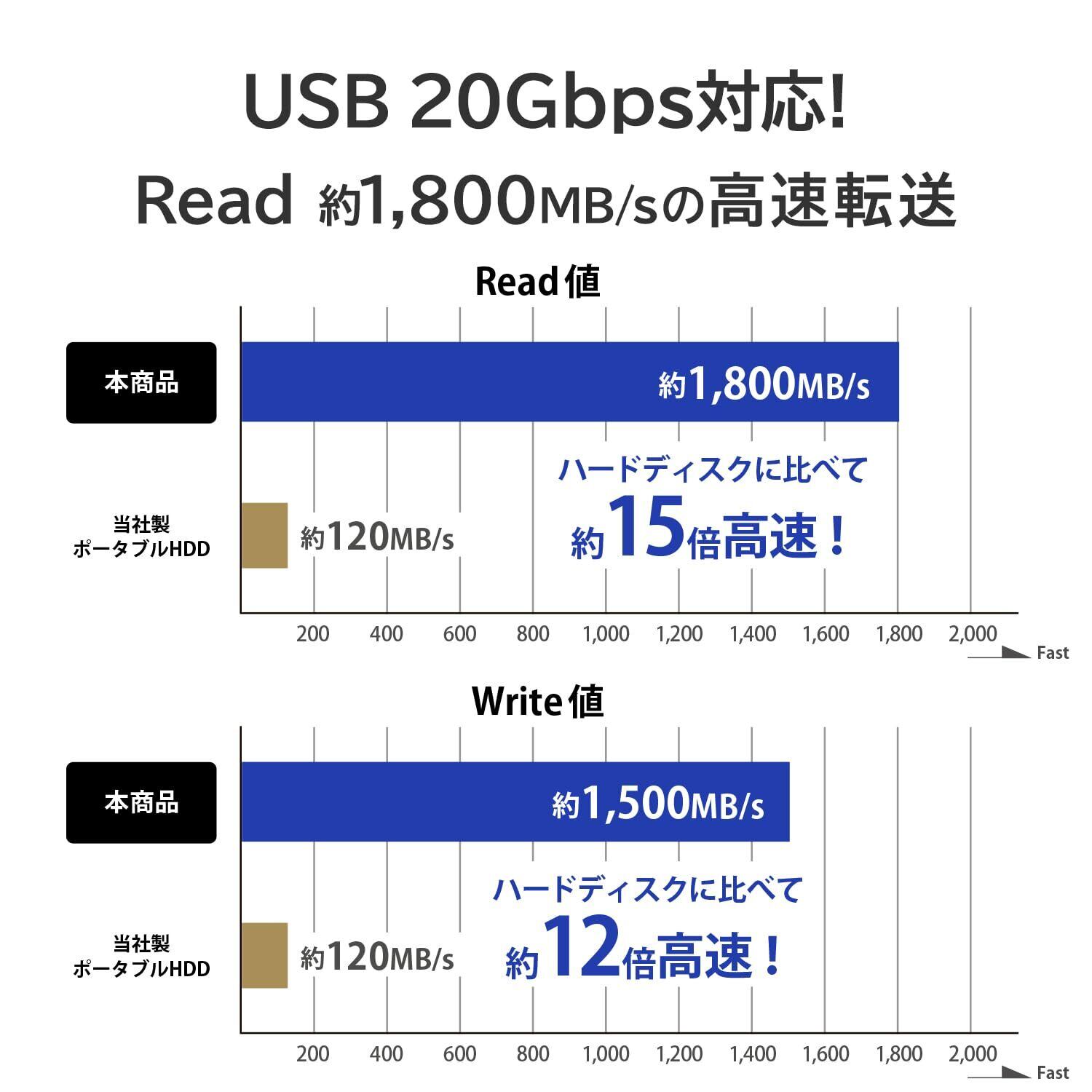 【USB 20Gbps対応!Read 約1,800MB/sの高速転送】高速インターフェイスUSB 20Gbps(USB 3.2 Gen2x2)に対応。読み込み速度は約1,800MB/s、書き込み速度は1,500MB/sと高速転送が可能です。