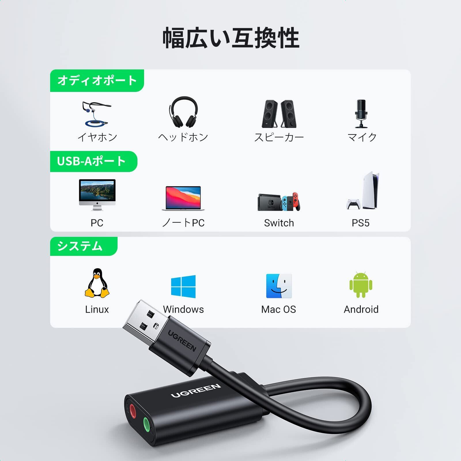 UGREEN USB オーディオ 変換アダプタ 外付け サウンドカード USB 3.5mm ミニ ジャック ヘッドホン・マイク端子 PS5 PS4,MacBook,Mac Mini,iMac,Windows PCなどに最適 ブラック