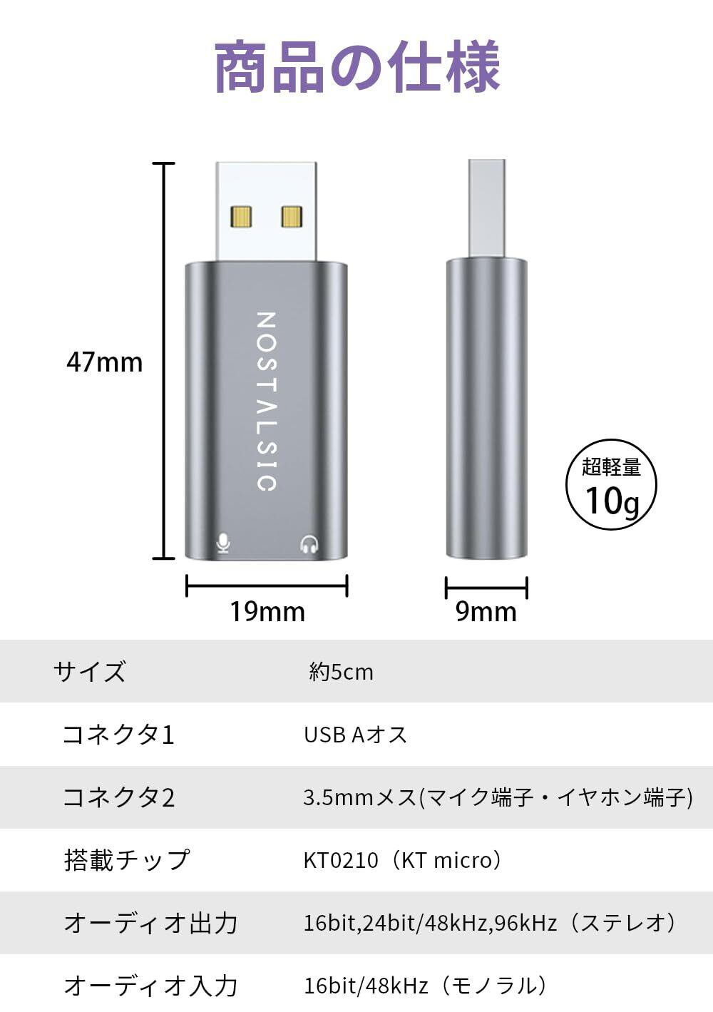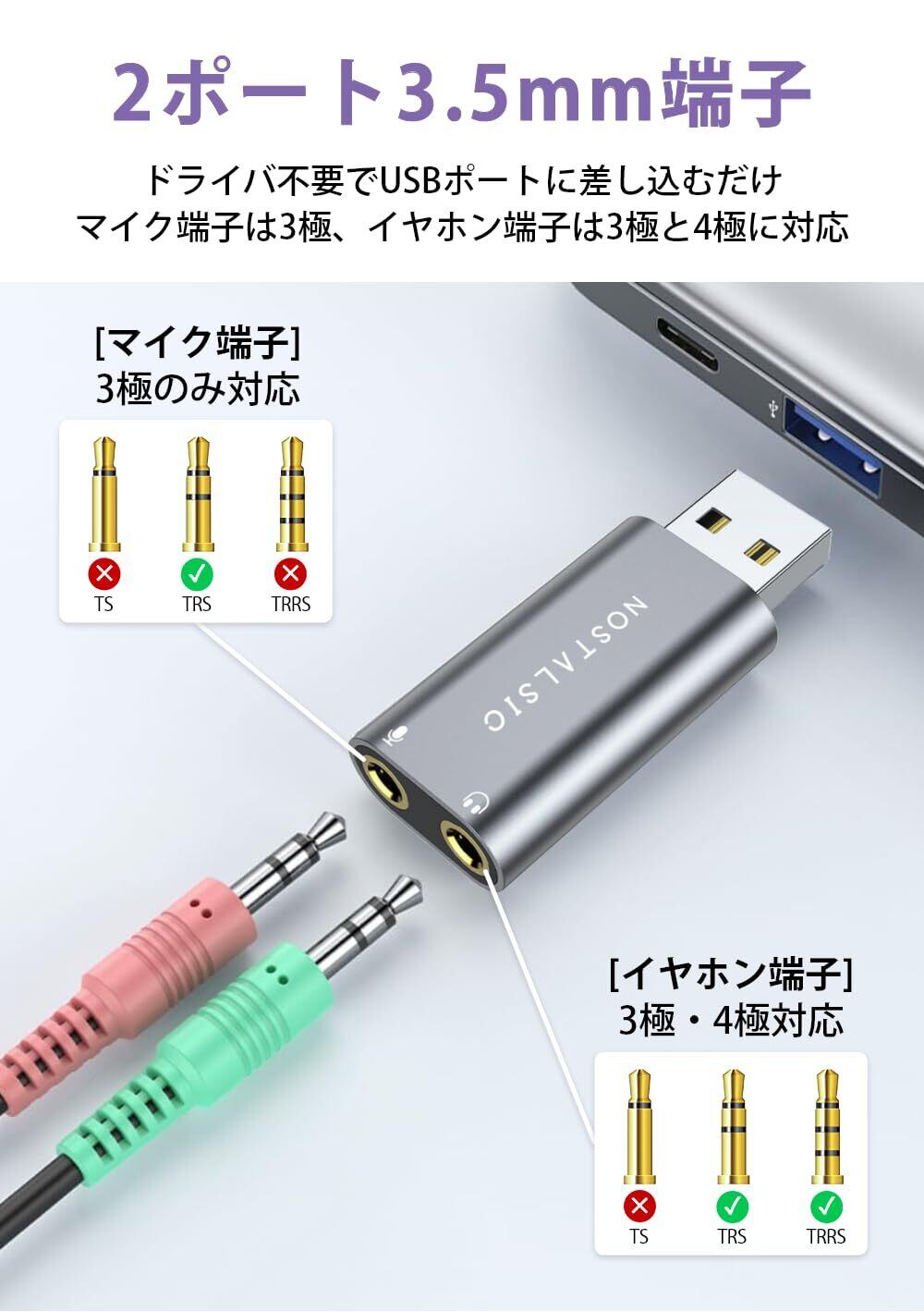 NOSTALSIC USB オーディオ 変換アダプタ USB2.0 to 3.5mm 外付け サウンドカード DAC搭載 24bit/96KHz対応 直挿しタイプ 3極(TRS)専用 イヤホン PS4 等適用 Windows/Mac OS/PS4/PS5/Linux/Chromebook等対応 (シルバー)