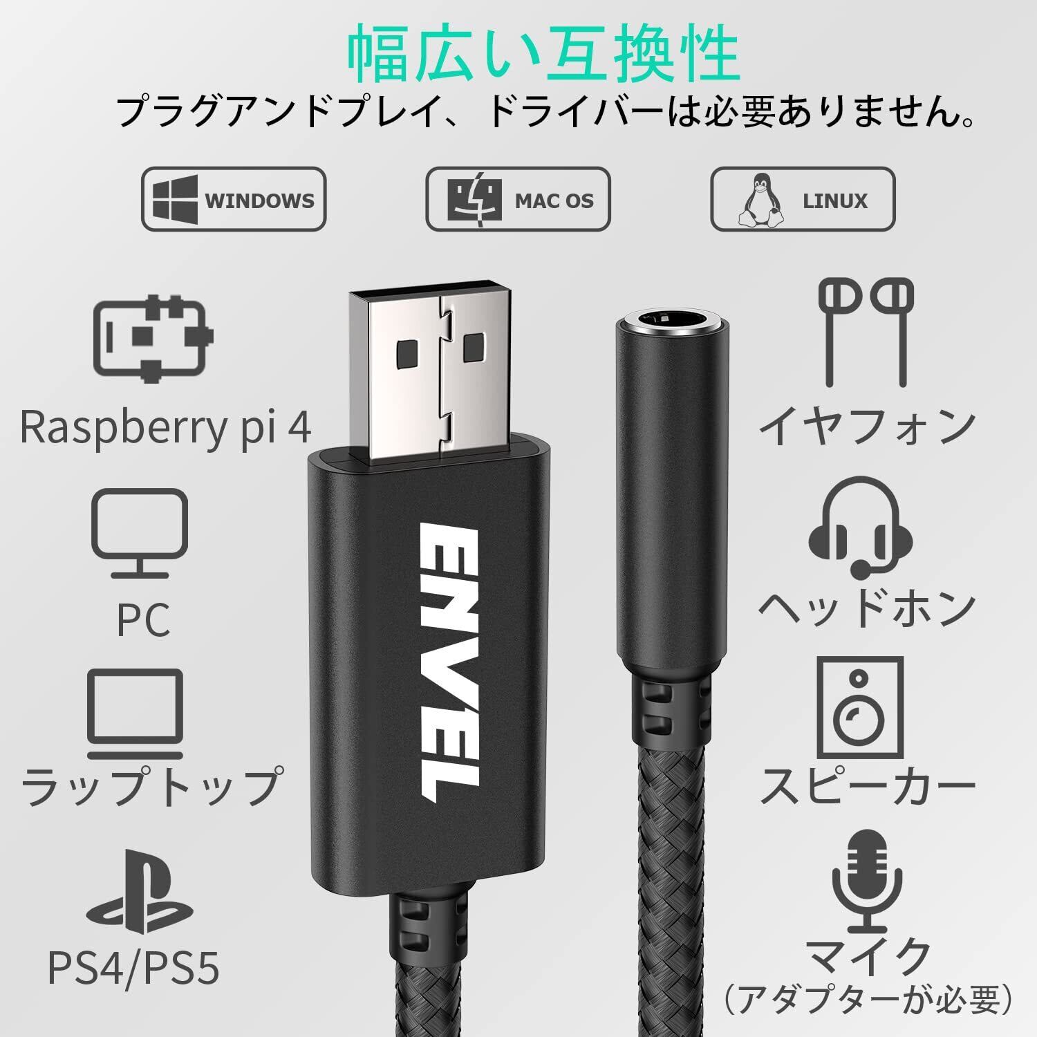 USB外部ステレオサウンドアダプター: このENVEL USBオーディオアダプターは、故障したサウンドカードやオーディオポートの交換に最適です.3.5mm TRRS AUXポート (統合オーディオインとオーディオアウトインターフェイス) をデバイスに簡単に追加します.PS5/PS4、PC、ノートパソコン、デスクトップ、MacBookなどのUSB対応デバイスに必要なガジェットです.PS3 / TV / Xbox / Carでは動作しません.