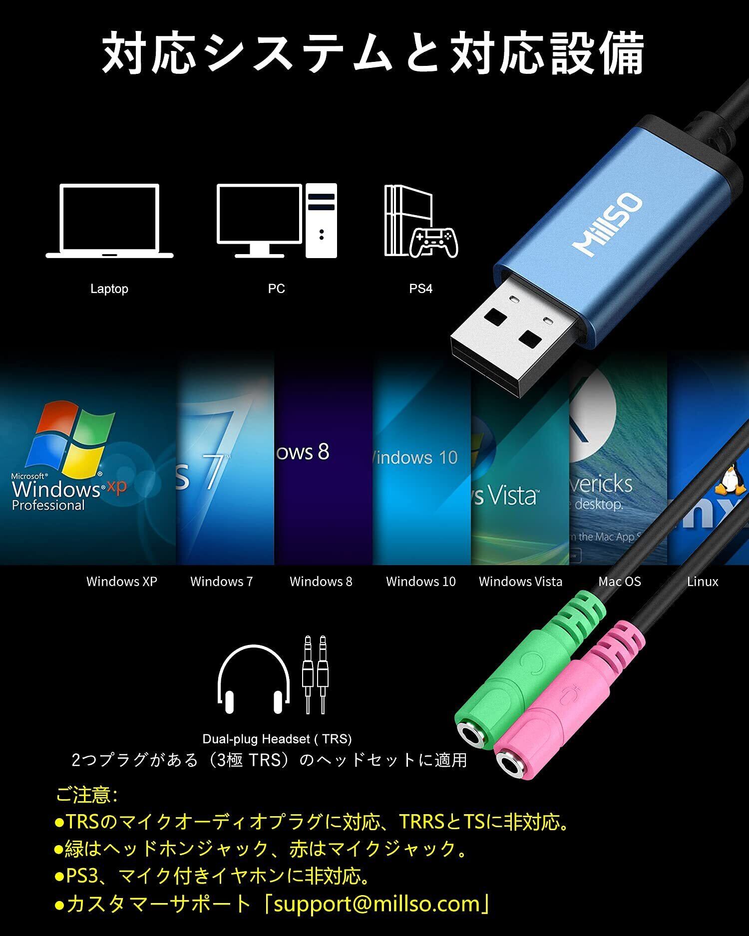 コネクタ形状:USBタイプA-3.5mmステレオミニジャック×2(イヤホン/緑、マイク/ピンク)。 【ご購入後も安心】MillSO USB変換アダプタは12ヶ月の品質付き、万が一商品に問題があった場合は、お気軽にご連絡ください。24時間内に早速に対応させて頂きます。「[email protected]」