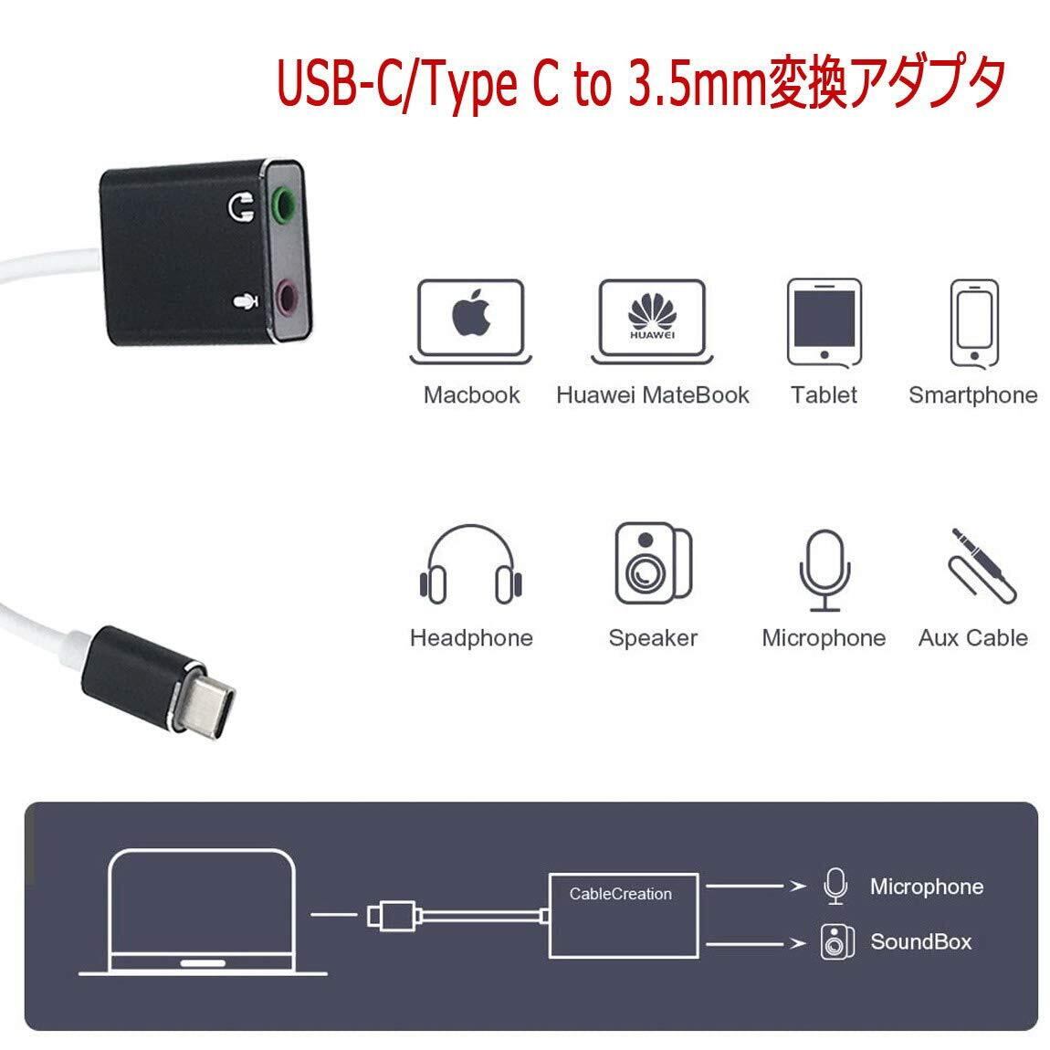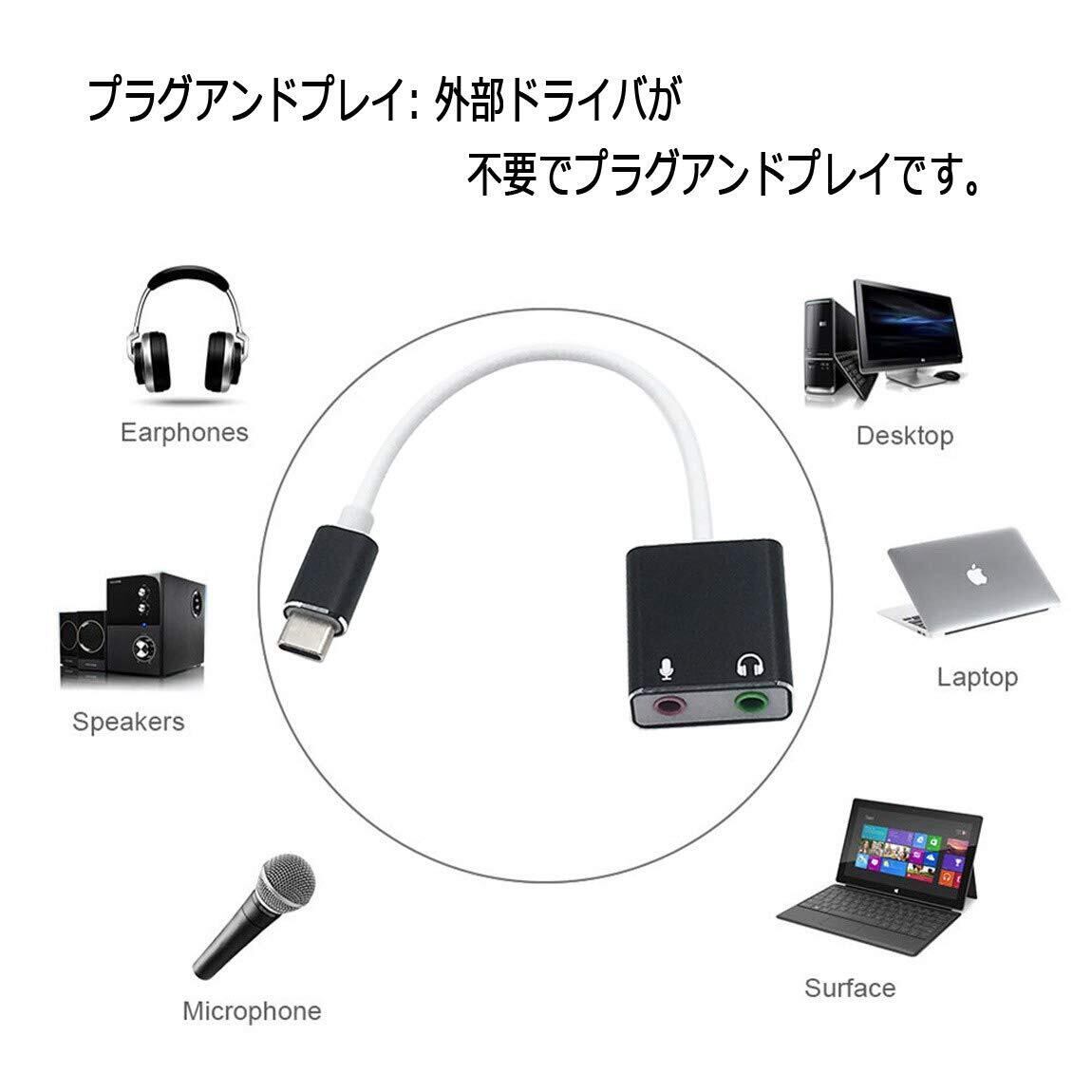 Type-C to 3.5mm変換アダプタャック ヘッドホン/マイク端子 プラグアンドプレイ。