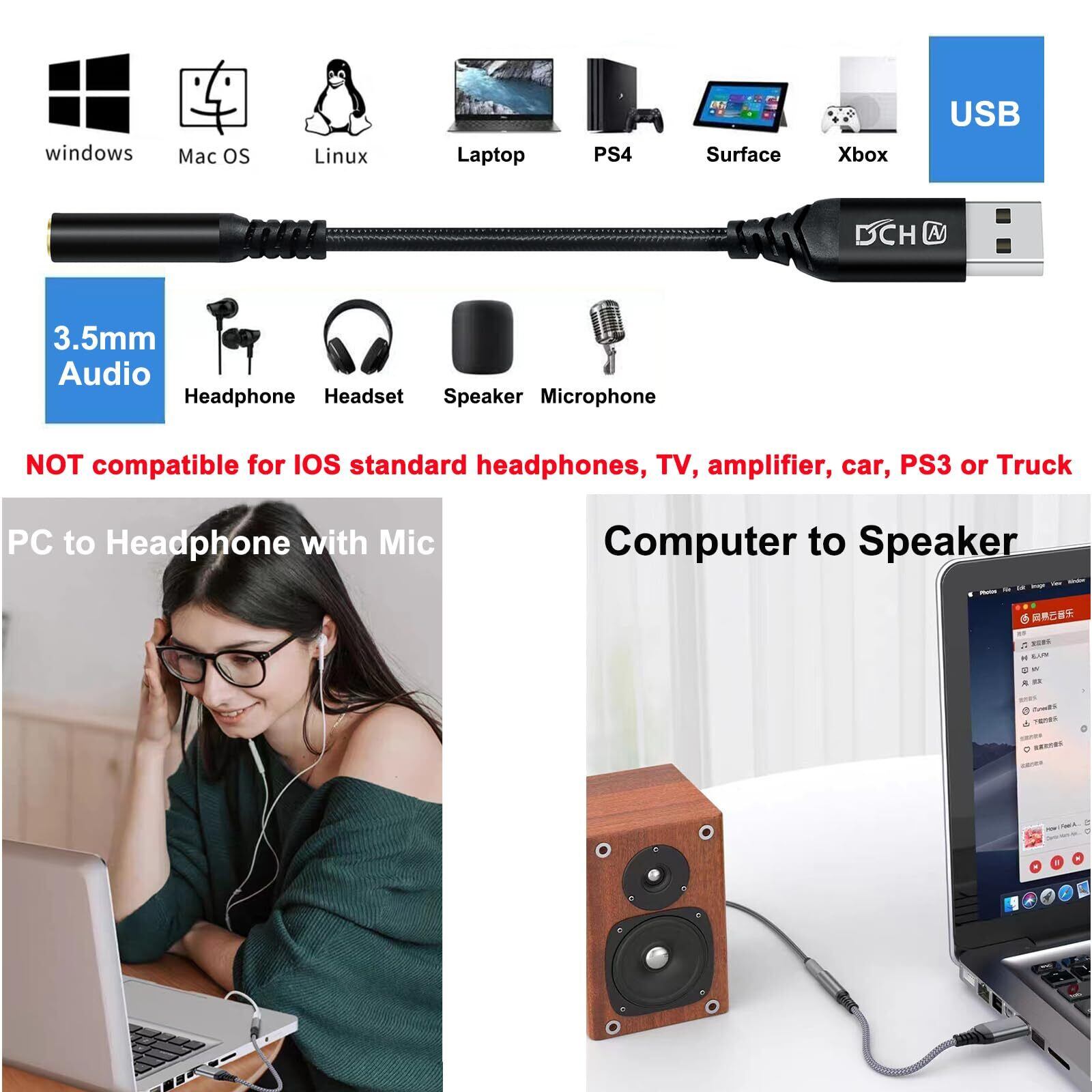 【幅広い互換性】Windows11/10/8.1/8/7/Vista/XP、Mac OS/X、PS4、Linux、Chromebook、Windows Surface 3 pro、Raspberry Piなどシステムでお使い頂けます。USB側はデスクトップパソコン(PC)、ノートパソコン、テレビなどに対応しています。PC3.5mmジャック側はマイク付きイヤホン、ヘッドセット、ヘッドホン、外付けマイクやサウンドボックスなどに対応しています。