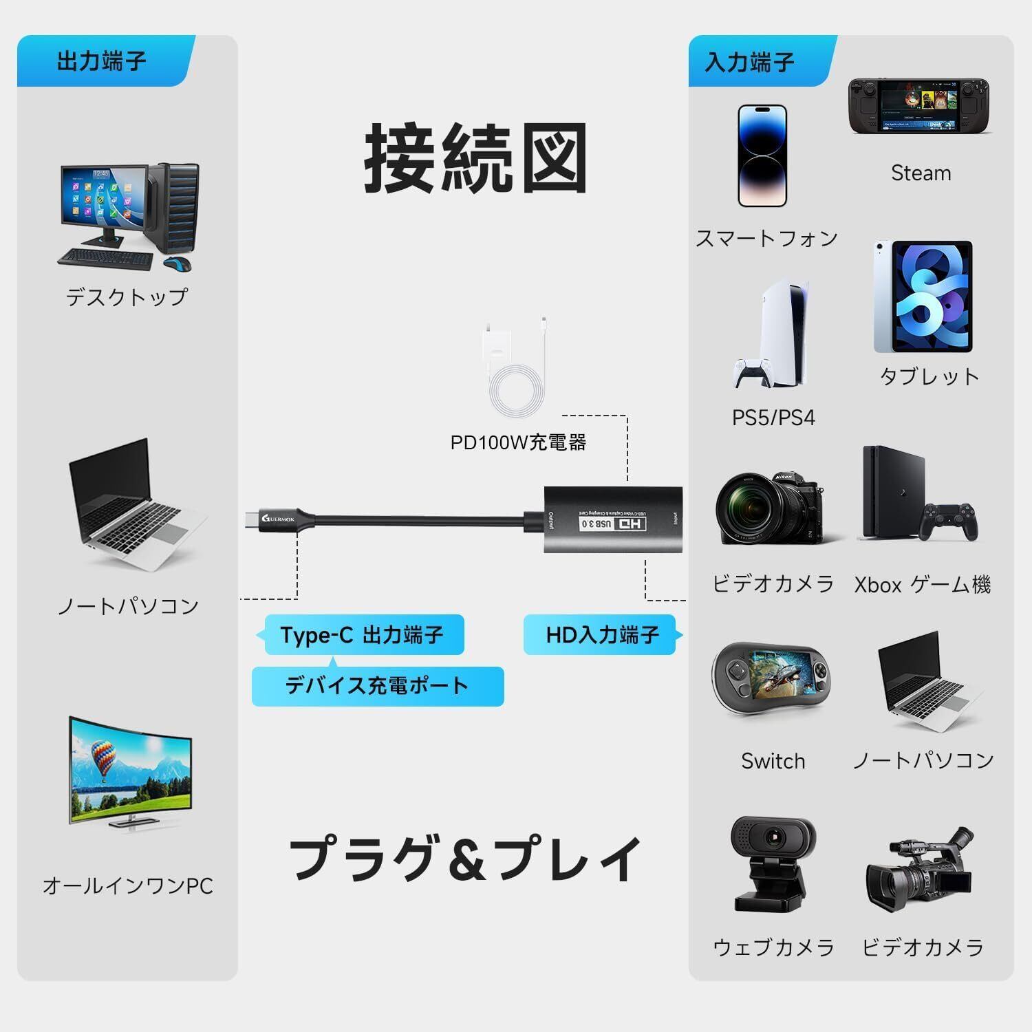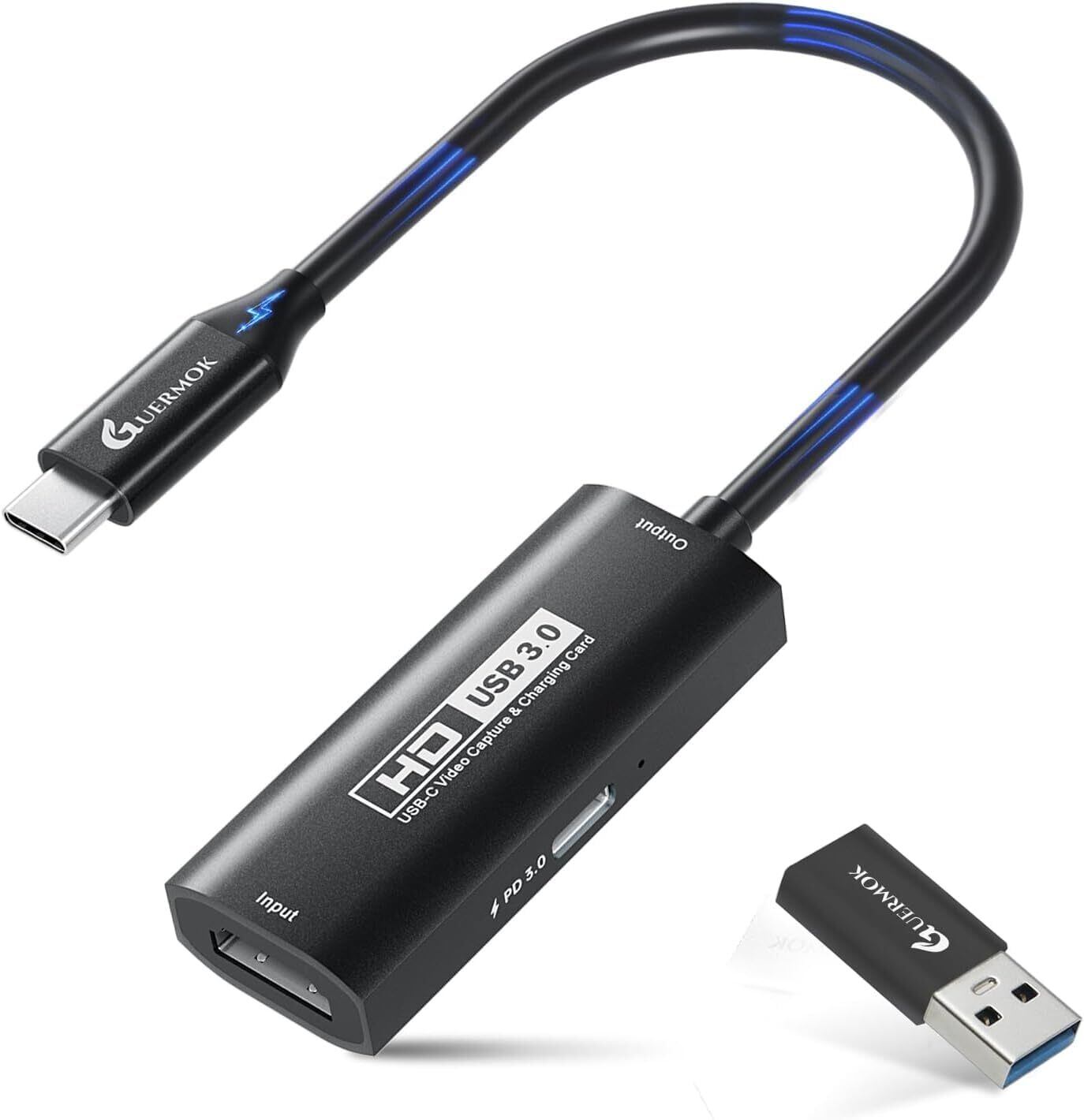 GUERMOK キャプチャーボード USB3.0 HDMI to USB-A/C(PD 100W対応)1080P 60fps録画 Type-Cアダプター付き Oculus/Quest 3・iPad・Mac・Switch・PS5/PS4対応 ブラック