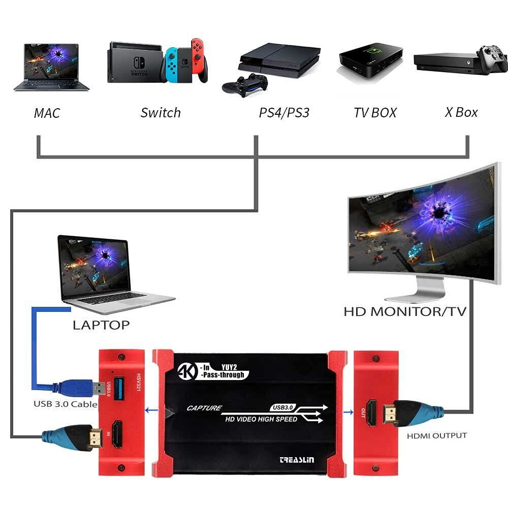 TreasLin USB3.0 HD ビデオキャプチャーボード Switch PS5 PS4 PS3 Xbox Wii U用サポート(4K30FPS入力 4K30FPSパススルー、HD HDMI 1080P60FPSゲーム録画・HDMIビデオ録画・ライブ配信用キャプチャーデバイス)OBS Potplayer YouTube Niconico Twitch HSV321