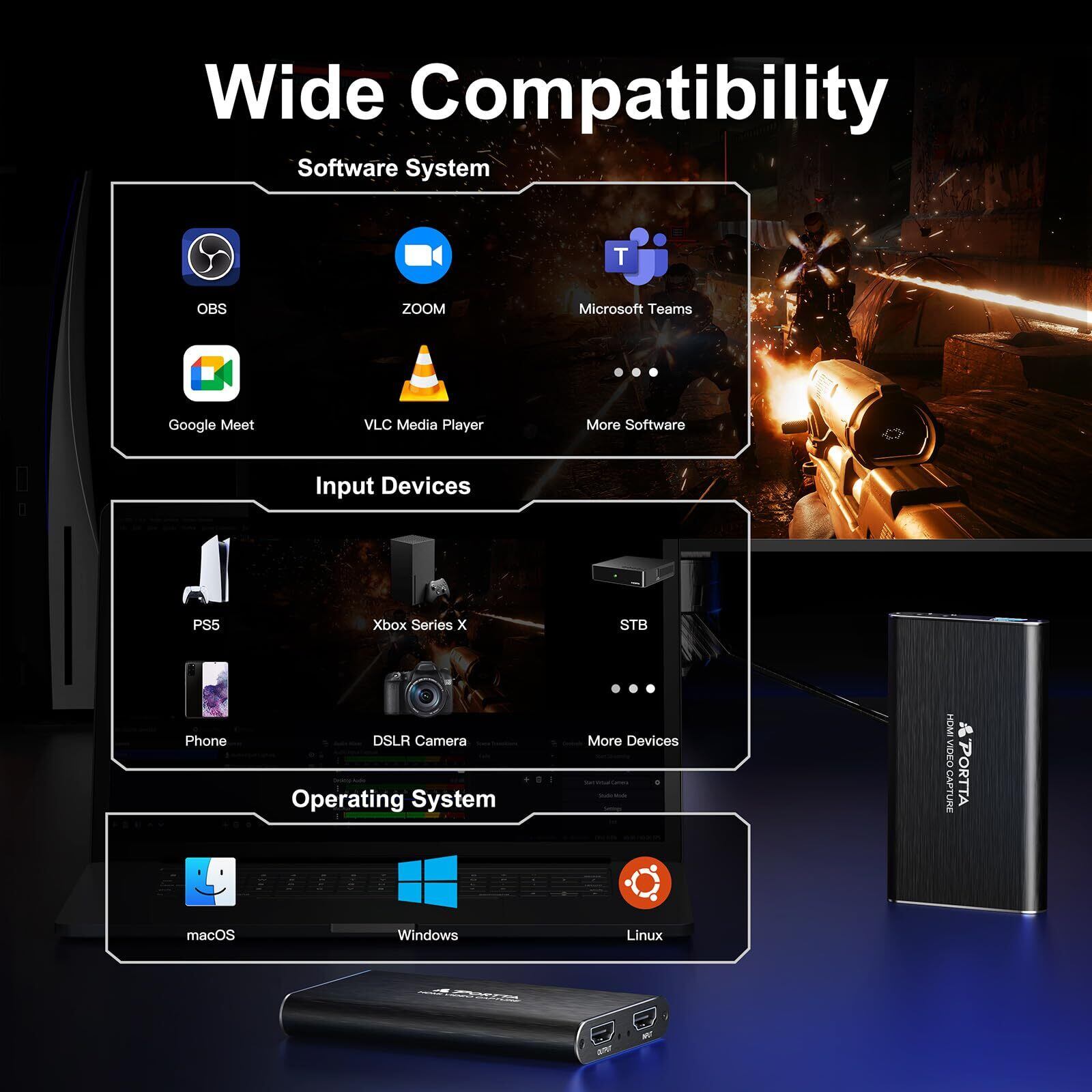 PORTTA HDMI キャプチャーボード パススルー, 1080P60 低遅延, ストリーミングと録画、4K HD MI入力/ループ出力、USB 3.0 - PCビデオカメラ、PS4、PS5、Xbox、Nintendo Switch 2、OBSに対応 (HDMI キャプチャーボード パススルー)