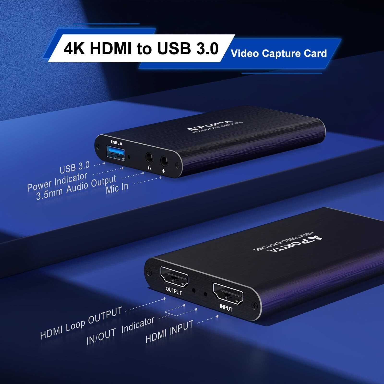 【HDMIビデオキャプチャ】PORTTA HDMIビデオキャプチャは、HDMI入力とループアウト(最大4K@60Hz、YUV 4:2:0)、USB 3.0経由の1080pキャプチャをサポートし、3.5mmオーディオ出力とマイク入力が含まれています。 ゲームストリーミング、ライブブロードキャスト、コンテンツ作成に最適です。 注意:ヘッドホン(TRSのみ)/スピーカーとHDMI OUTはマイク音声を受信できません。