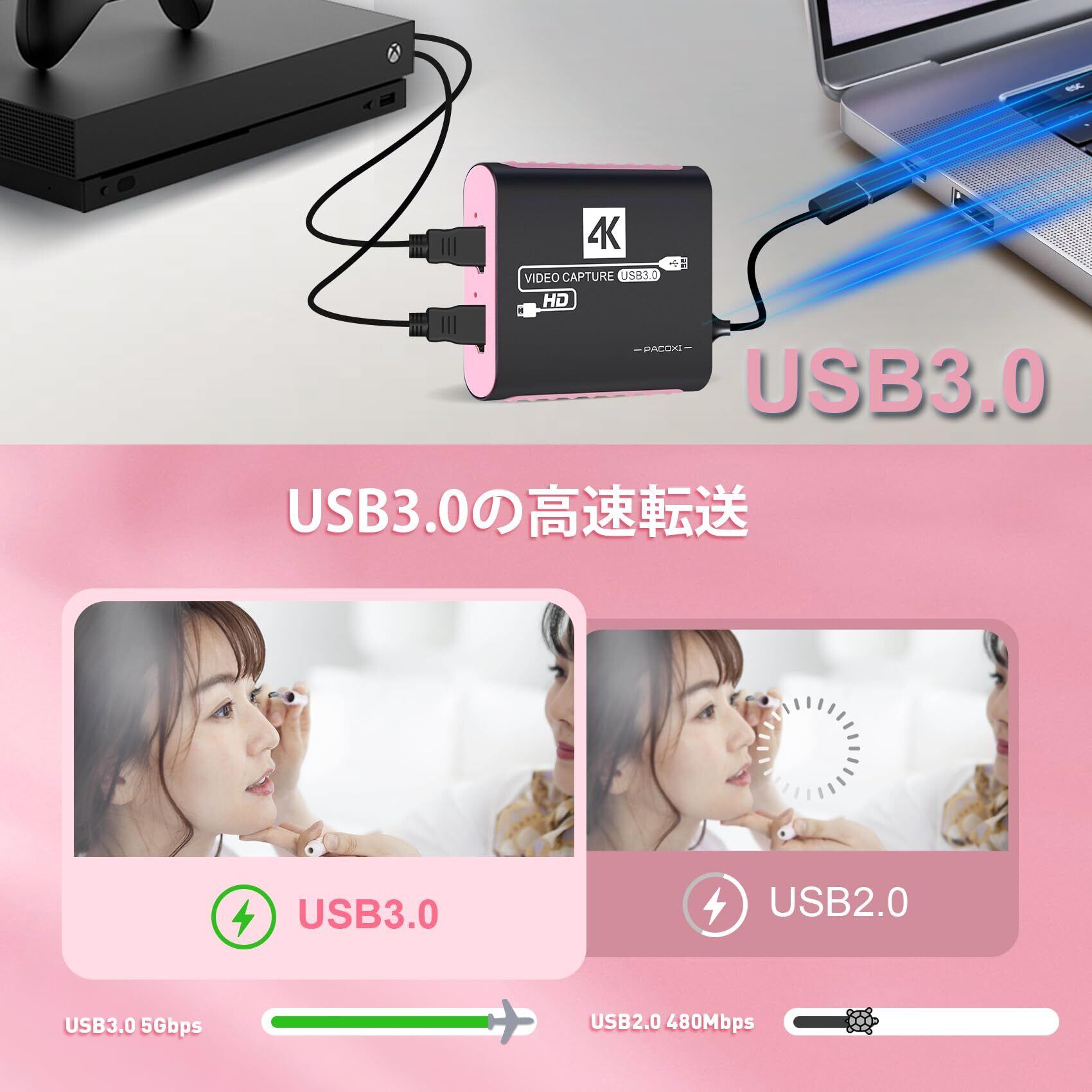 【USB3.0高速伝送】ゲームキャプチャーは、USB3.0インターフェースを通じて高速データ伝送を実現し、最大伝送速度は毎秒5Gbpsです。Twitch、YouTube、OBS、PotPlayer、XSplit、QuickTime Playerなどのプラットフォームでのライブ配信と録画に適しており、ゲームとビデオ録画中にほとんど遅延がありません。