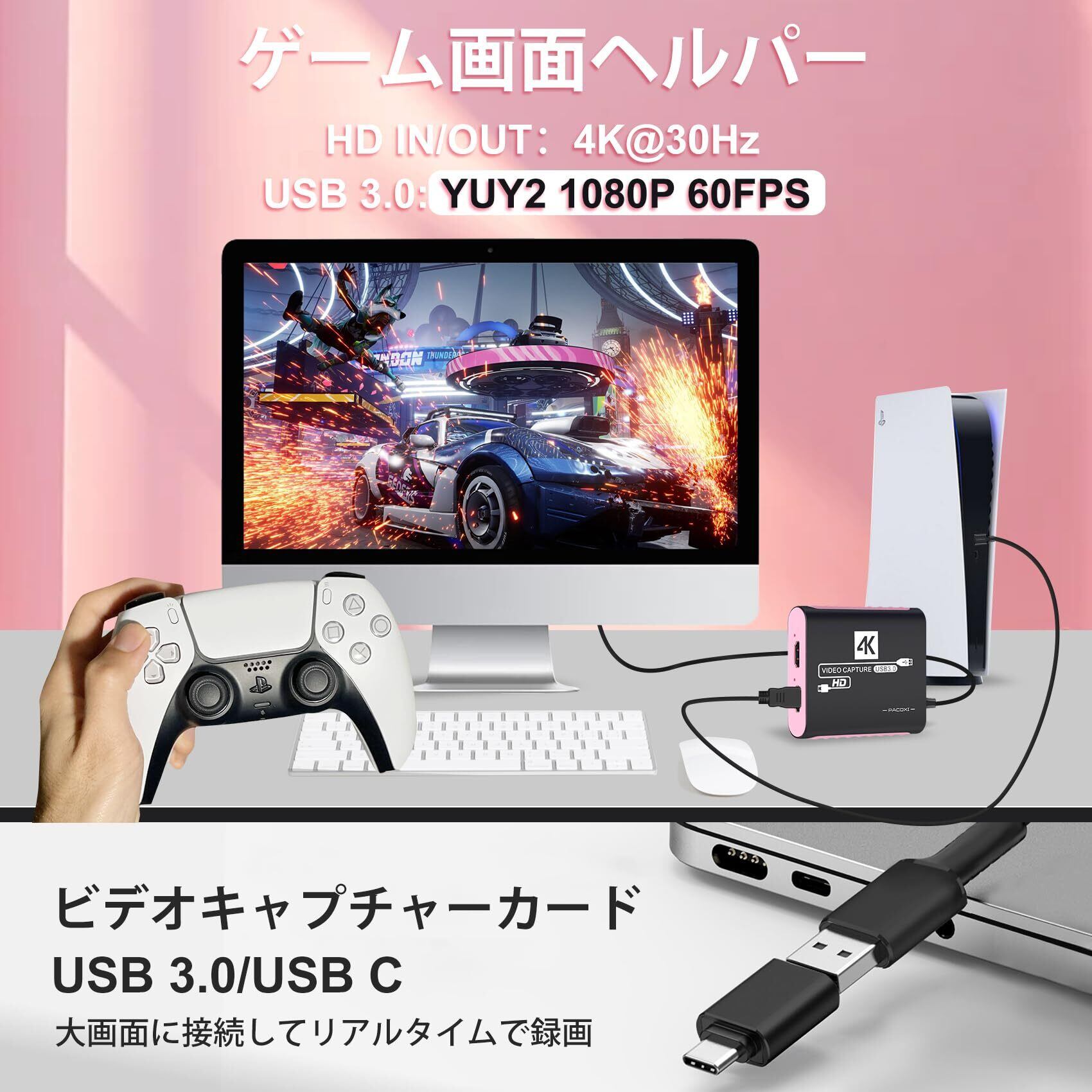 USB 3.0 ビデオキャプチャーボード switch対応(4K30FPS 入力、4K30FPS パススルー、1080P60FPS 録画 HDMI キャプチャーデバイス)、PC ゲームライブ配信録画、リアルタイムストリーミング、画面共有に適用 PS5/PS4、Xbox One、Wiiu、webカメラ対応 Win 7/8/10/11、Mac、Linux、Android に適用