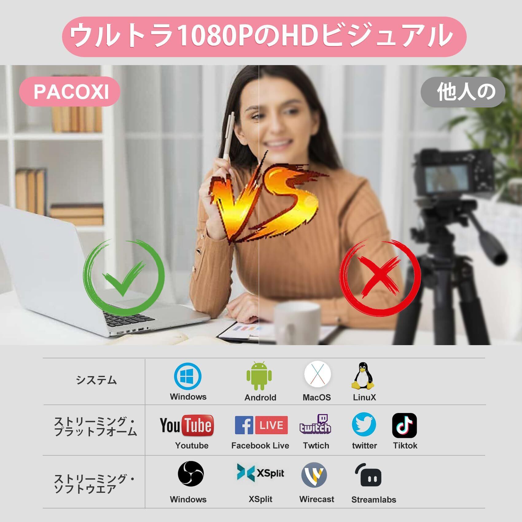 【広範な互換性】ビデオキャプチャーは、Windows 7/8/10/11、Linux、Mac OS、Android 5.0以降などの多くのオペレーティングシステムと互換性があります。OBS、TikTok、YouTube、Twitter、Facebook Liveなどの複数のストリーミングプラットフォームに対応し、ユーザーがさまざまな環境でスムーズに使用できることをします。