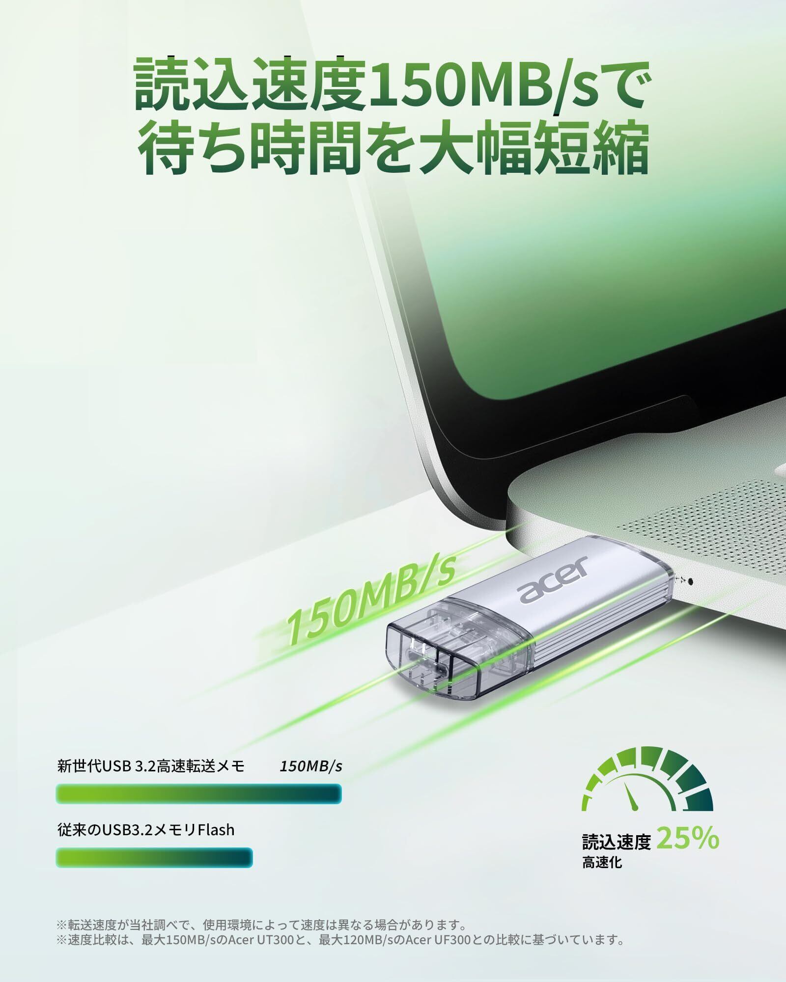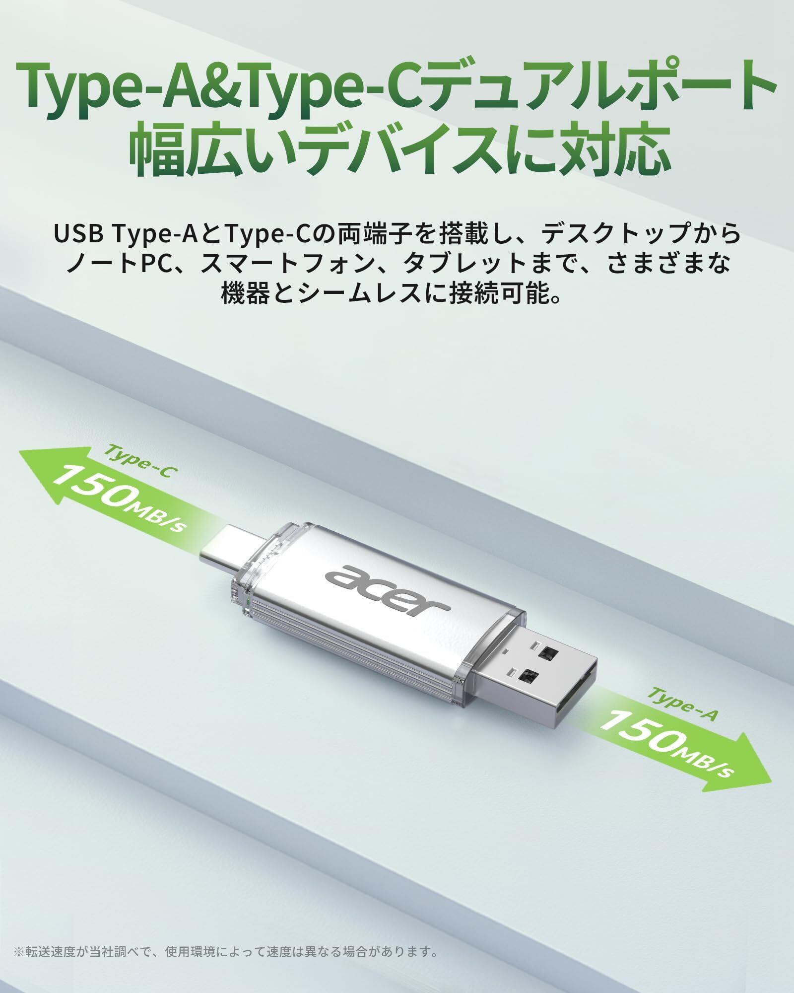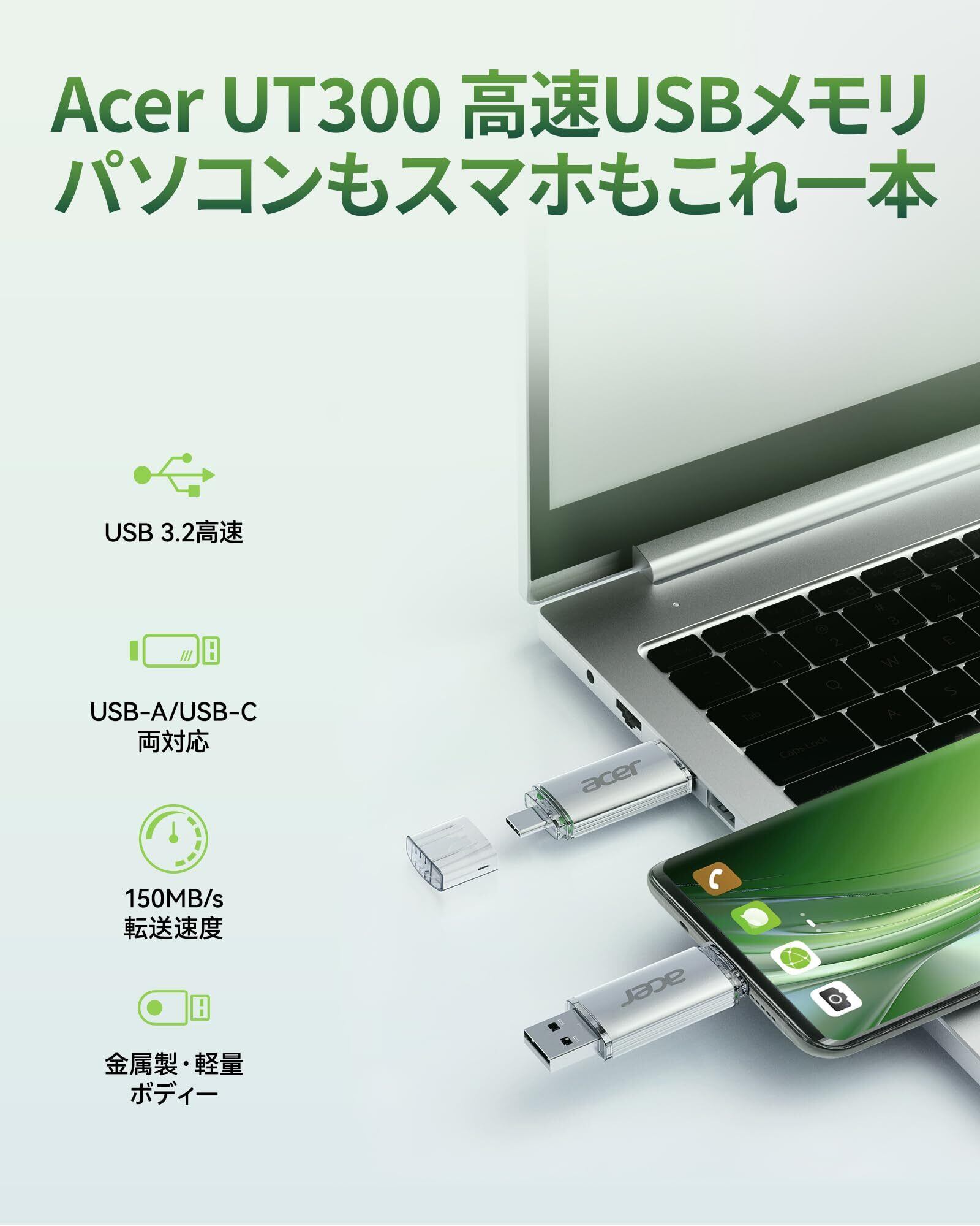 Acer UT300 USBメモリ 64GB USB 3.2 最大読出速度150MB/s USB-A/C両対応 高速 フラッシュメモリドライブ 金属筐体 - BL.9BWWA.589