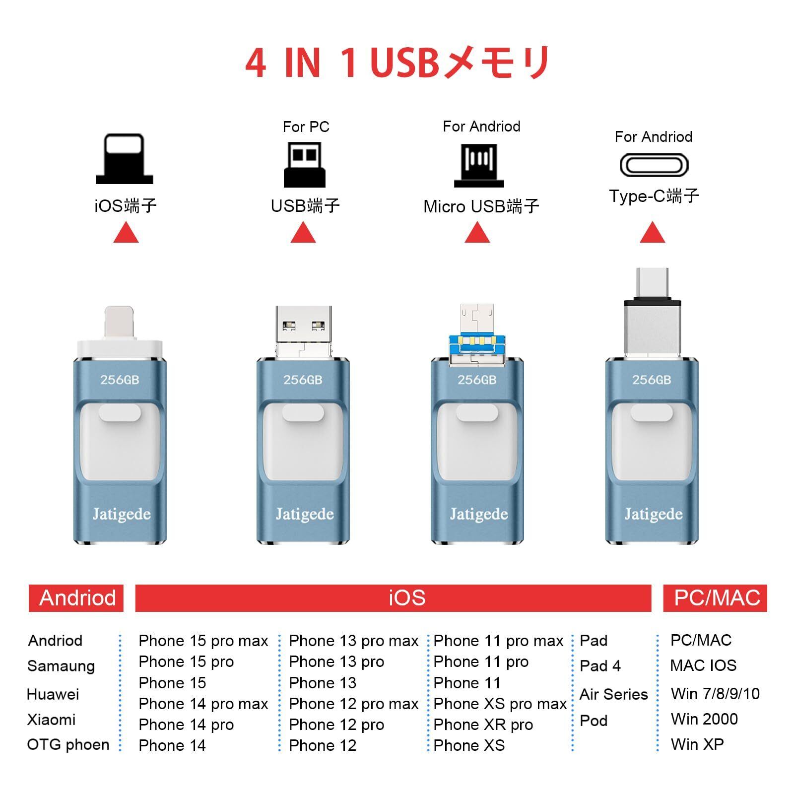 256GB Phone対応usbメモリ【アプリ不要】 写真保存 直接usbに写真を移す4in1 フラッシュドラメモリ人気 USB 両面挿しスマホ USB メモリー フラッシュドライブ Android パソコン対応 USBメモリ phoneの写真 を パソコン に 取り込む 容量不足解消