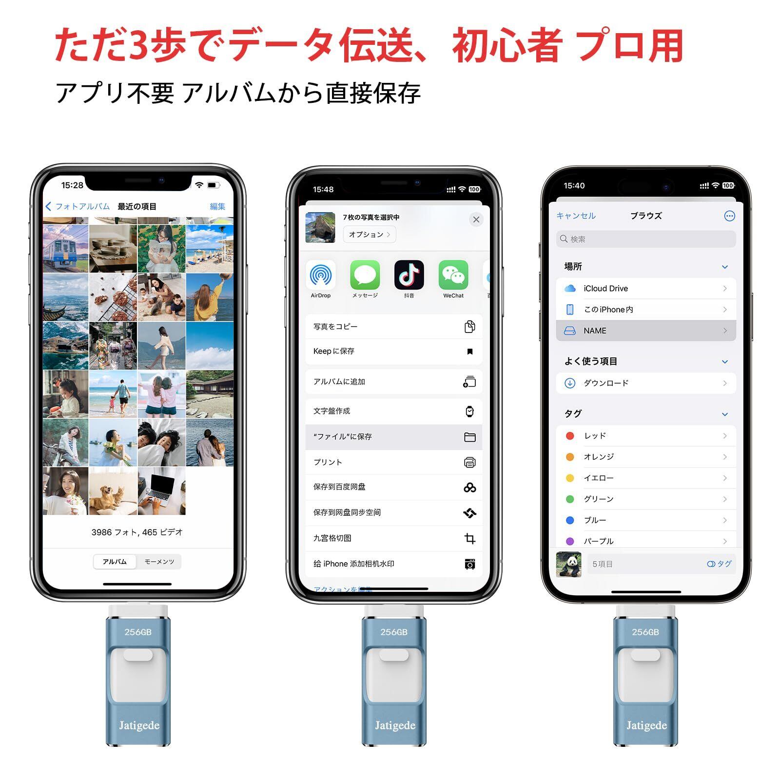 【4in1 多機種対応・専用アプリ必要なし、安心安全usbメモリ】当社のusbメモリは専用アプリ必要なくて、Ap社の「ファイル」を使用して、phone データ直接保存可能です。他社の専用アプリ必要usbメモリに比べて、アプリのダウンロードの邪魔がなくて、phone・iPadのデータが直接バックアップ可能、もっと便利、安心安全!さらに、IOS・USB-A・USB-C端子が4 IN 1で、幅広いデバイスを対応可能で、データ転送、phone・iPad容量不足、簡単に解消出来ます。