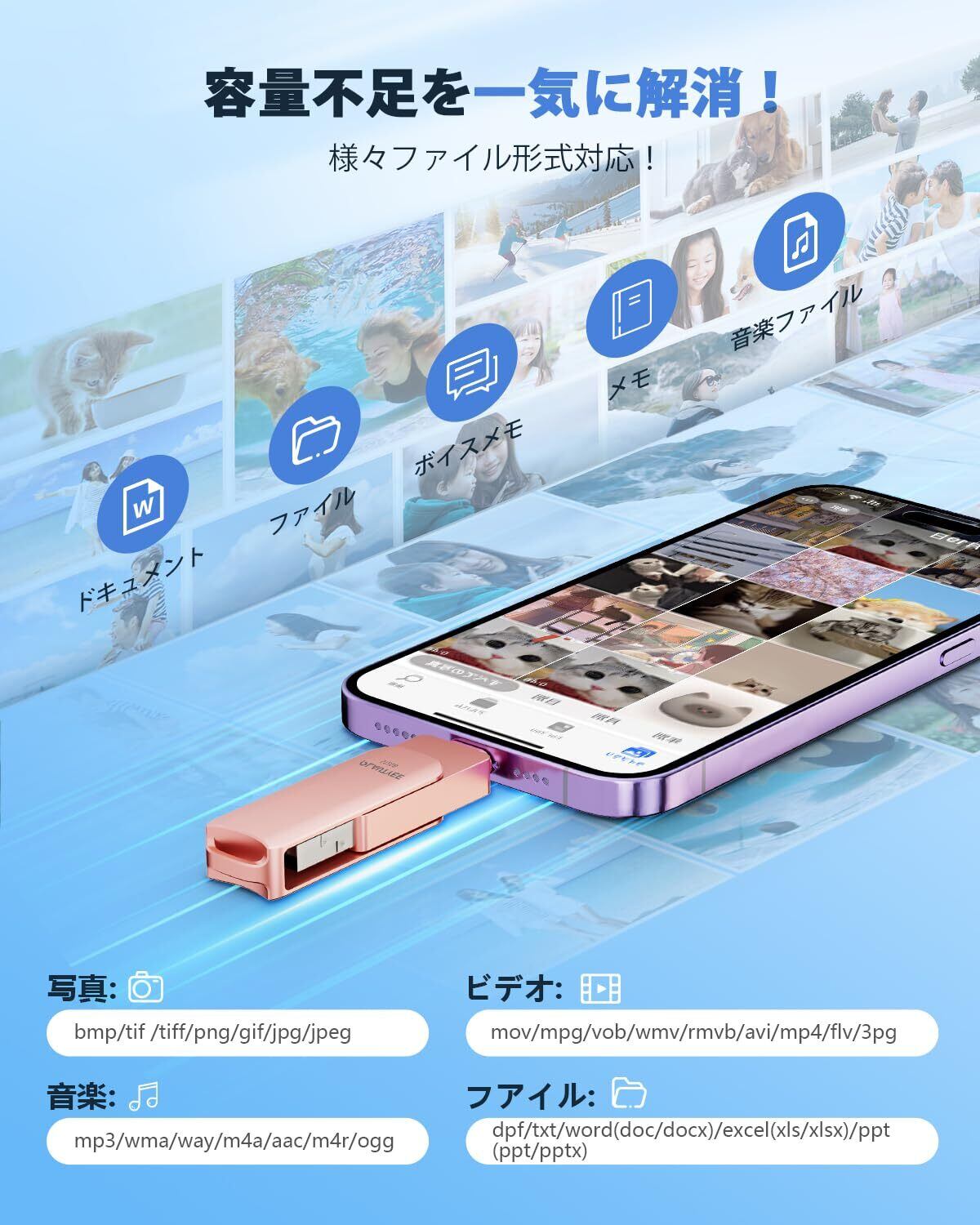 【スマホの容量不足に困って?】スマホの容量を空けたい、容量が足りない、データ整理をする時間がない。スマホ内の写真やデータの移行に便利なusbです。写真や動画だけでなく、ほとんどの形式のドキュメント・ファイル・ボイスメモ・メモ・音楽ファイルも保存できます。