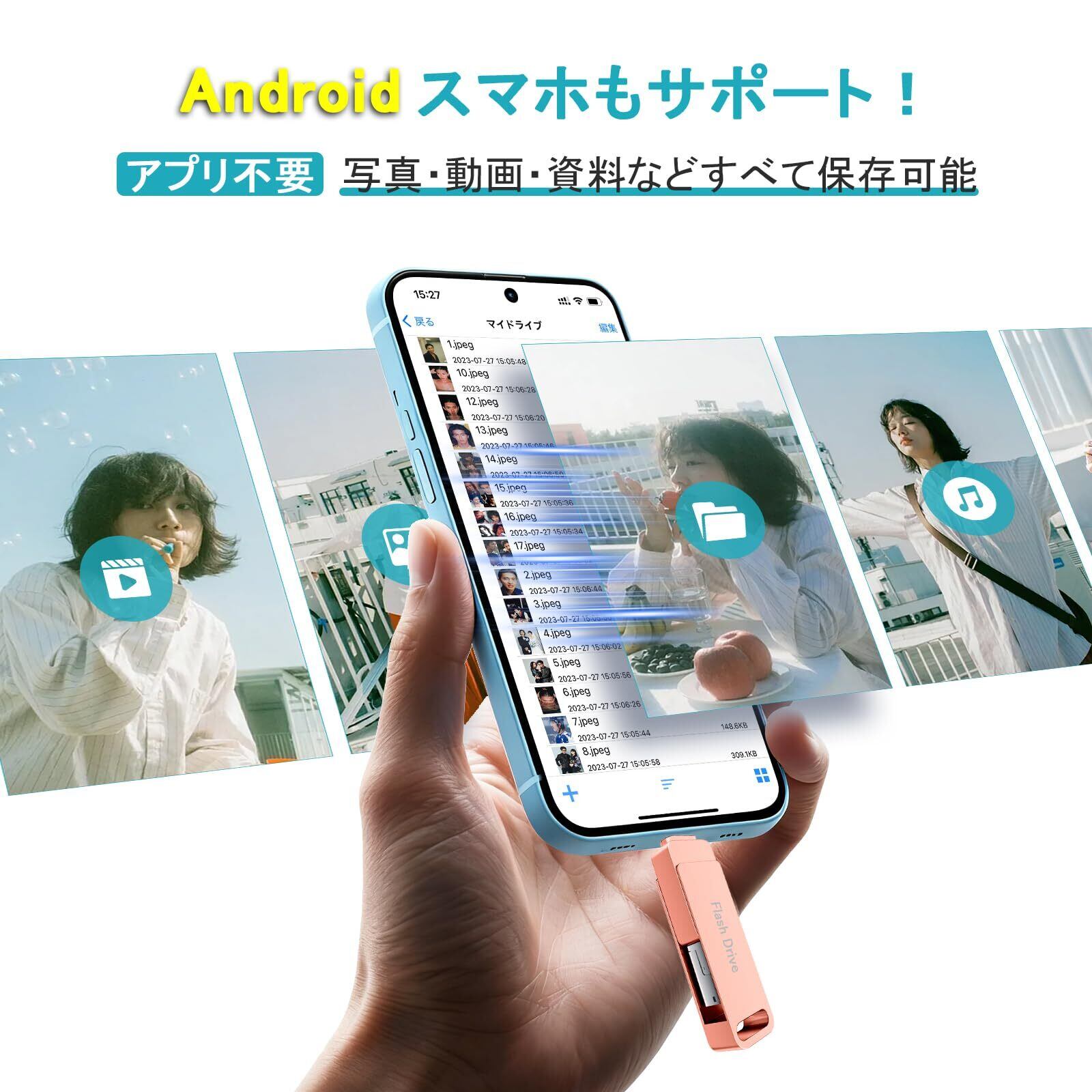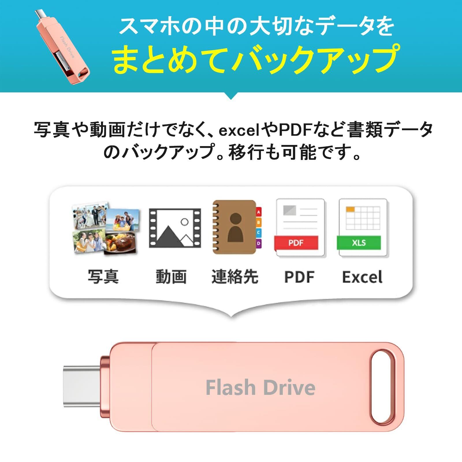 「スマホ容量対策のUSBメモリ・フラッシュドライブ」本スマホ USBメモは超軽量でコンパクトなスタイリッシュボディ、そしてキャップレスの360°回転式デザインで、どこにでも持ち運べます。スマホで撮った写真をフラッシュドライブに保存したい時、会議資料を素早く共有したい時、wifiとパソコンがない場合など便利で、旅行・通勤・会議に最適なiphone usbです。