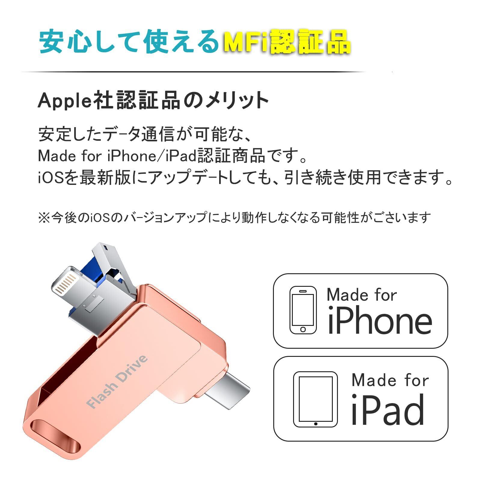 「安心して使えるMFI認証iPhone usbメモリ」当社のusbメモリはApple社のMFi認証取得を取得、認証番号。Made for iphone/ipad認証Lightning USBメモリは安定したデータ通信が可能で 、IOSを最新版にアップデートしても、引き続き使用出来ます。