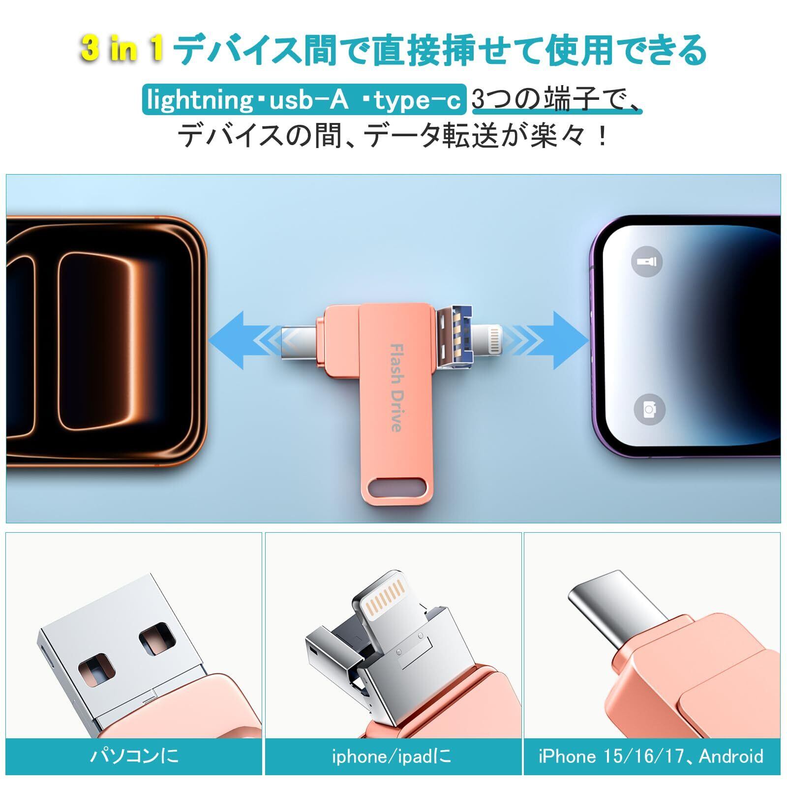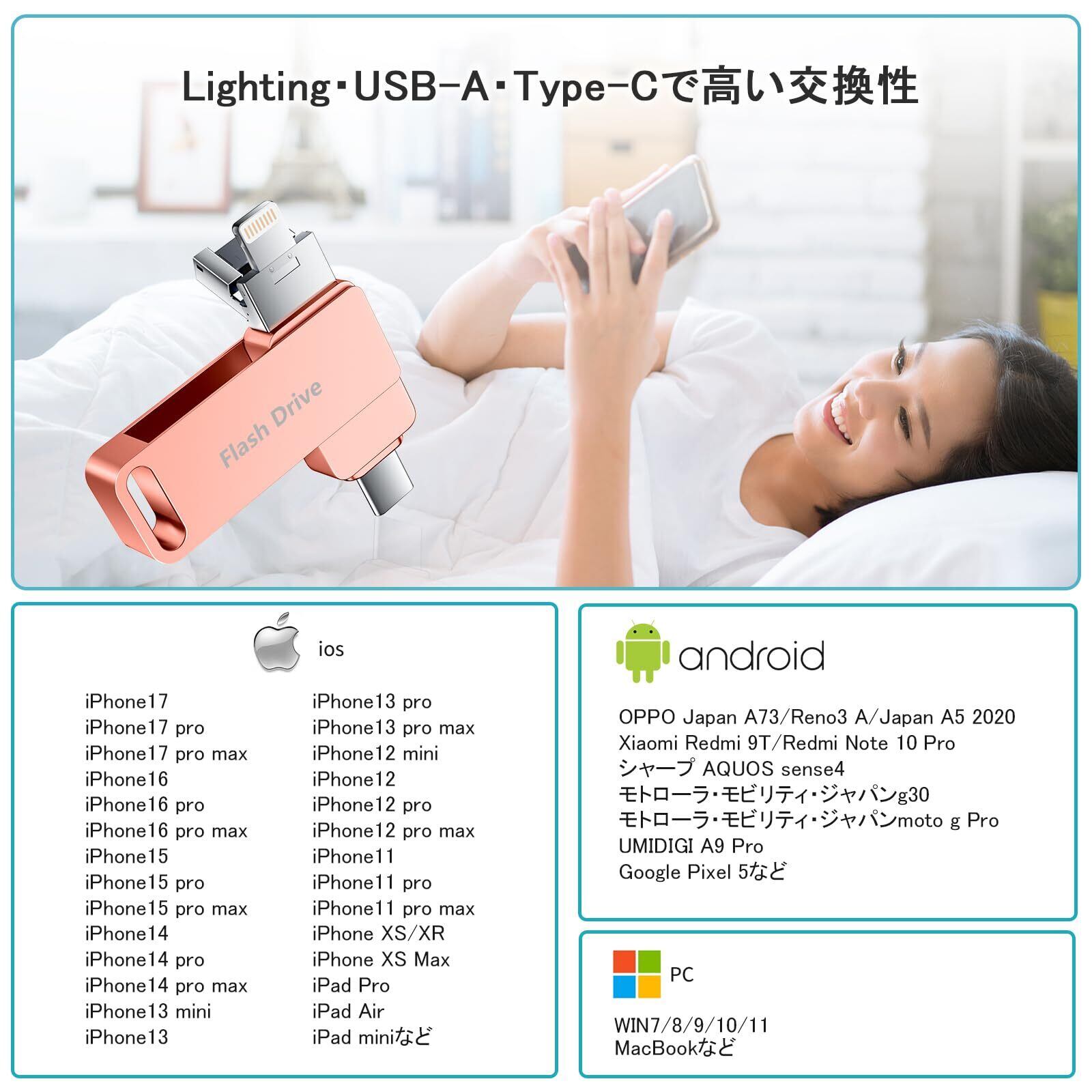 「3 IN 1 人気のランキングusb メモリiphone」当社のUSBメモリ・フラッシュドライブはlightning・usb-A ・type-c 3つの端子がつきので、iphone iPad iPod/Win Macではなく、Androidでも使用可能で、デバイスの間、データ転送が楽々!更に、当社のUSBメモリはUSB3.0対応でUSB2.0より性能アップさせ、高速なデータ転送を実現、大容量のデータや写真・ビデオも短時間で転送可能です。