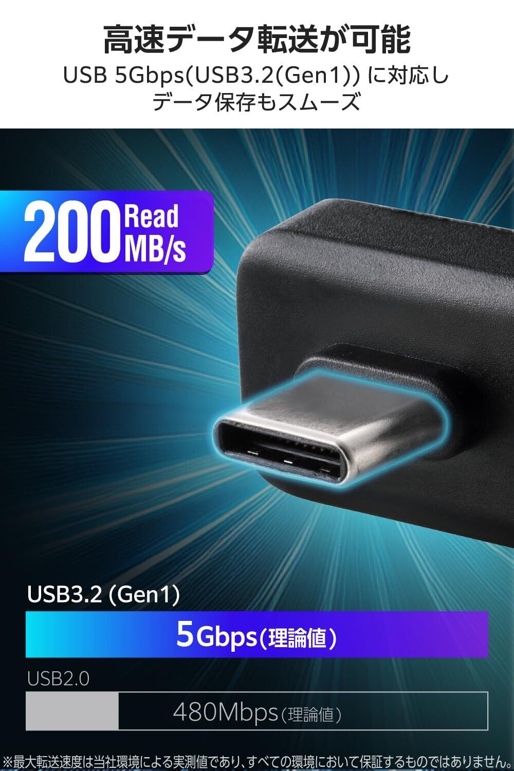 USB 5Gbps(USB3.2(Gen1)/USB3.1(Gen1)/USB3.0)対応で、小型サイズながら、読み込み時の最大データ転送速度200MB/sを実現しています。
