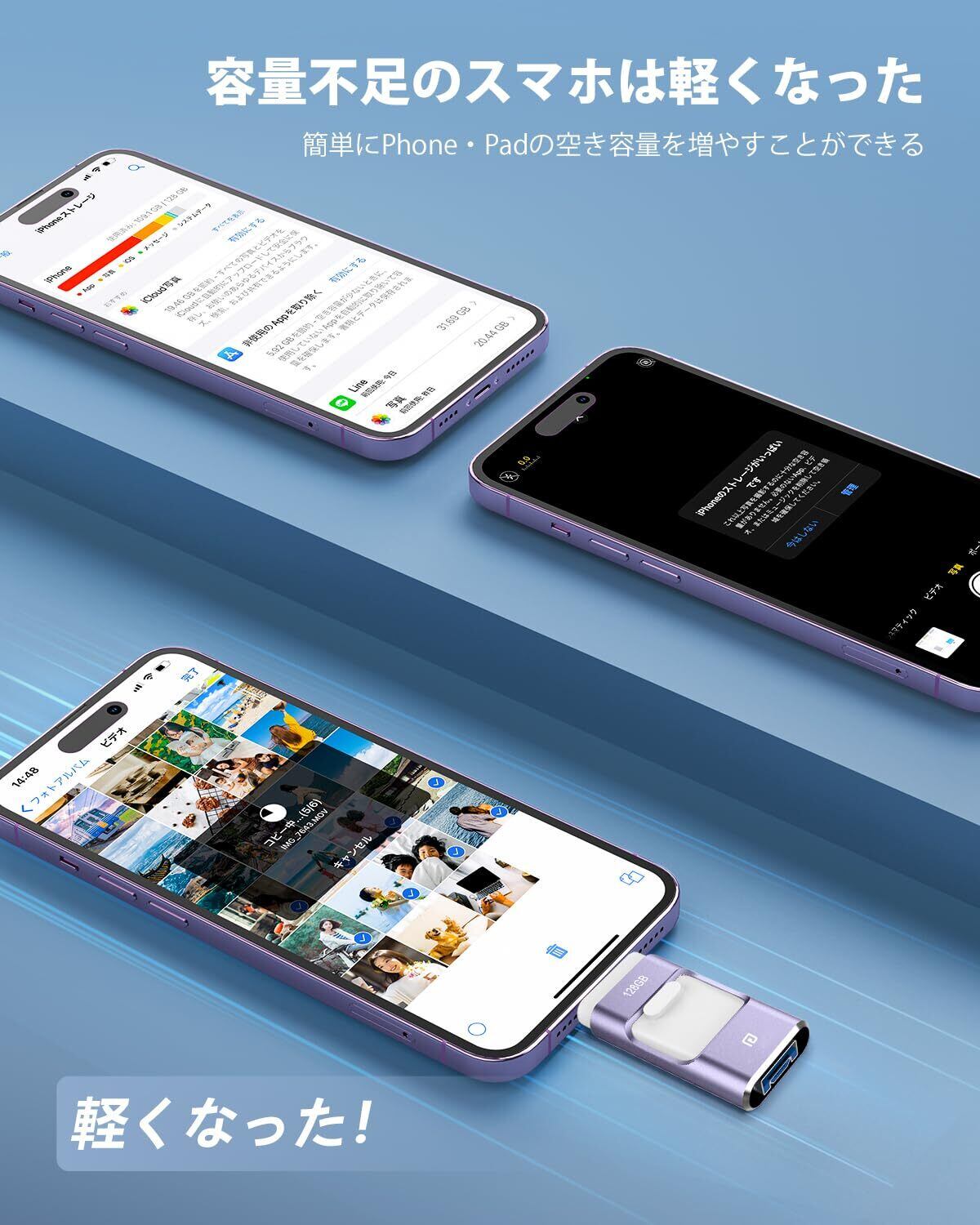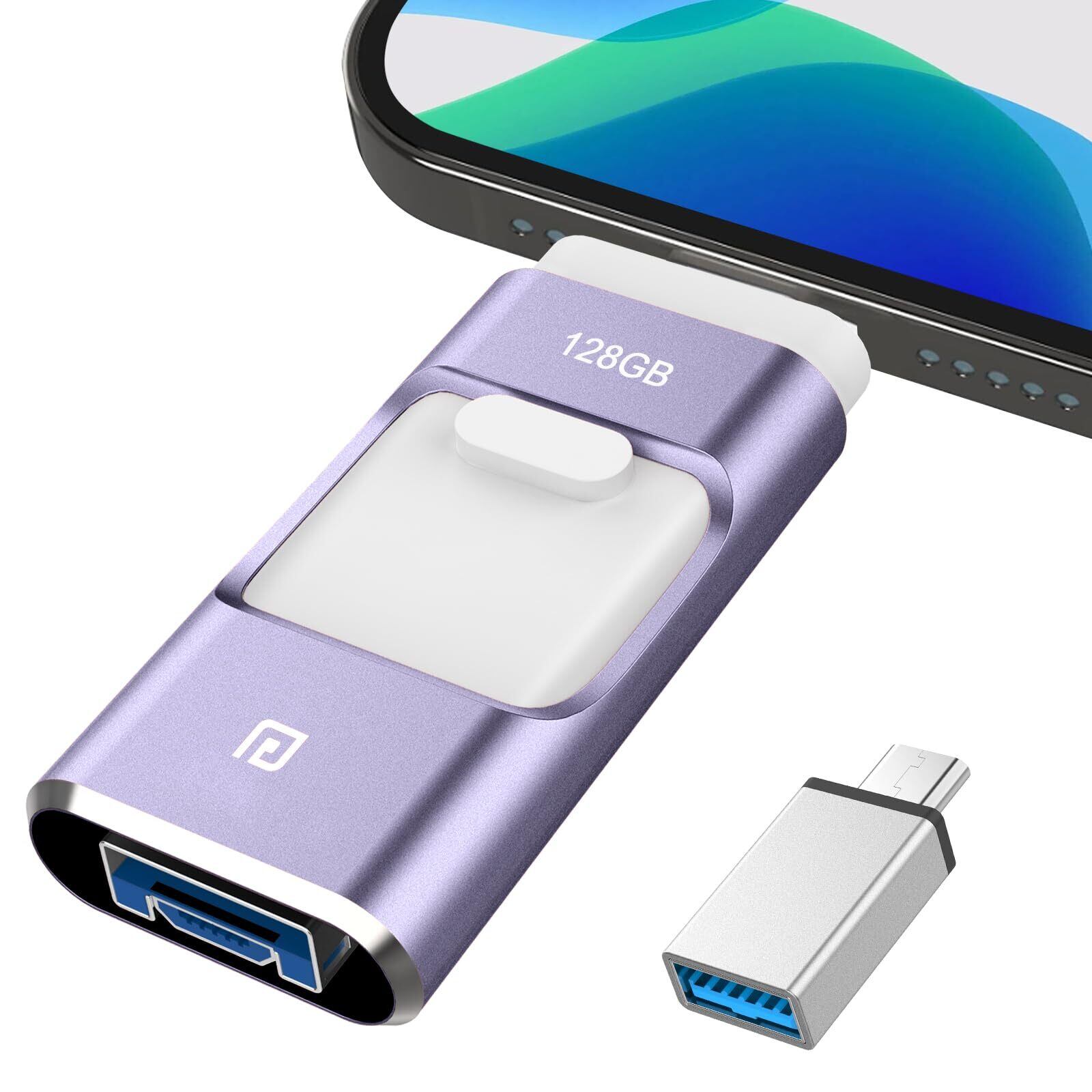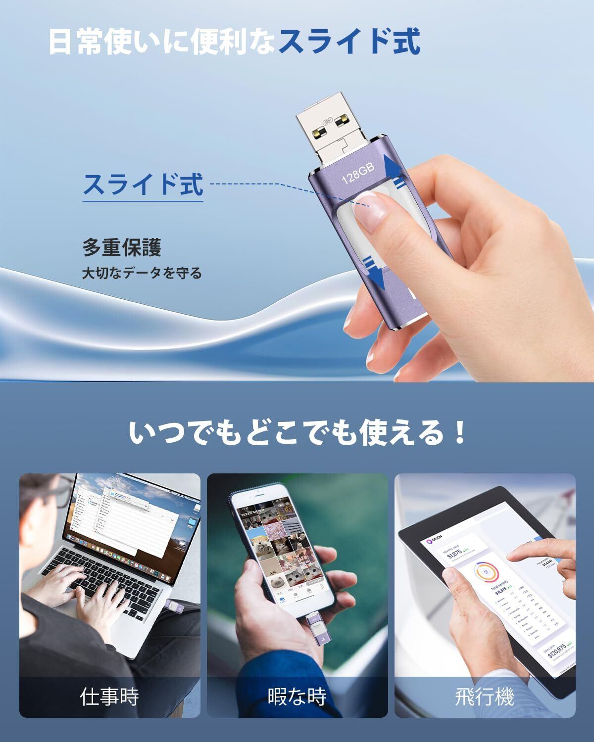 【2025年登場 専用アプリ不要】4in1 iPhone対応 USBメモリ 128GB 高速 データ バックアップ iPad対応 usbメモリー スライド式 iOS/Type-C/USB/Micro USB搭載 外付け スマホ 写真データ保存 容量不足解消 Phone/PC/Macbook/iPad対応 紫 Phone16/ 15/14 Plus/13/12 /XS/