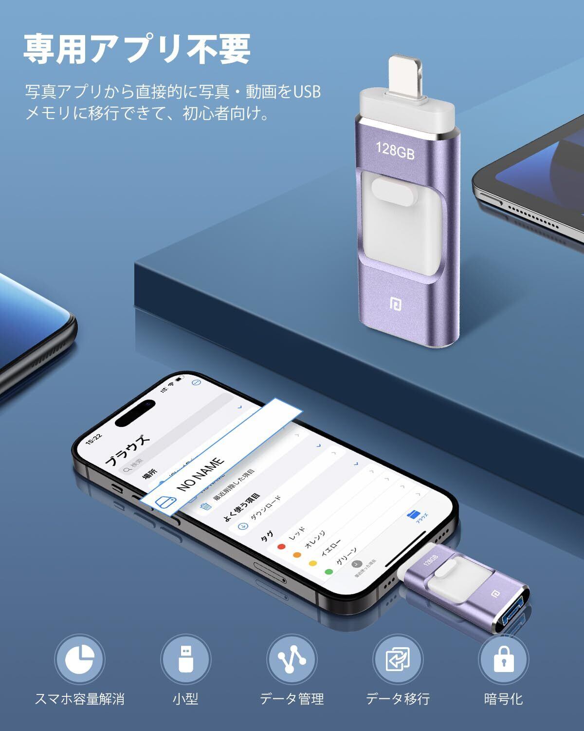 【アプリ不要、全面的にアップグレード!】専用アプリをダウンロードしないと使えない?最新技術でアップグレードされた新登場のiPhone対応USBメモリは、専用アプリをダウンロードせずにデータを移行できて、専用アプリから解放します。USBメモリーをスマホに挿入するだけで、写真や動画などのデータをスマホのアルバムからUSBメモリに保存できて、スマホに付属している「ファイル」アプリではUSBメモリーに保存されているデータを確認できます。