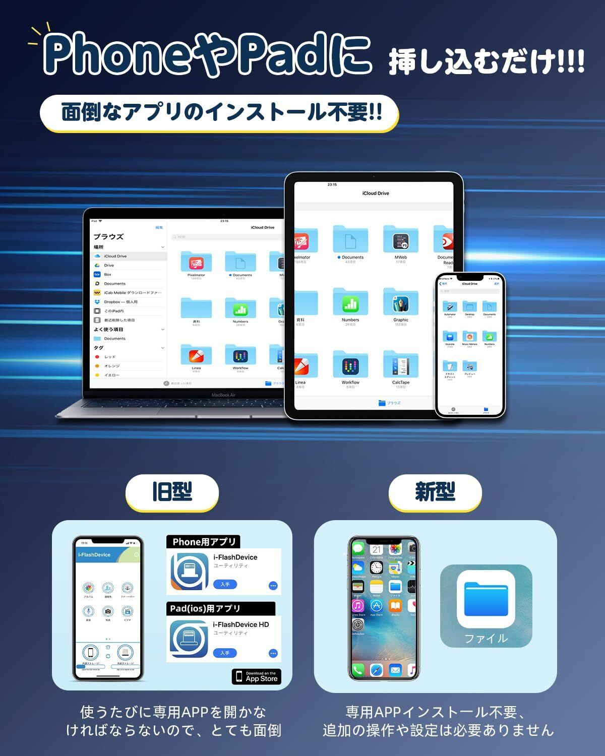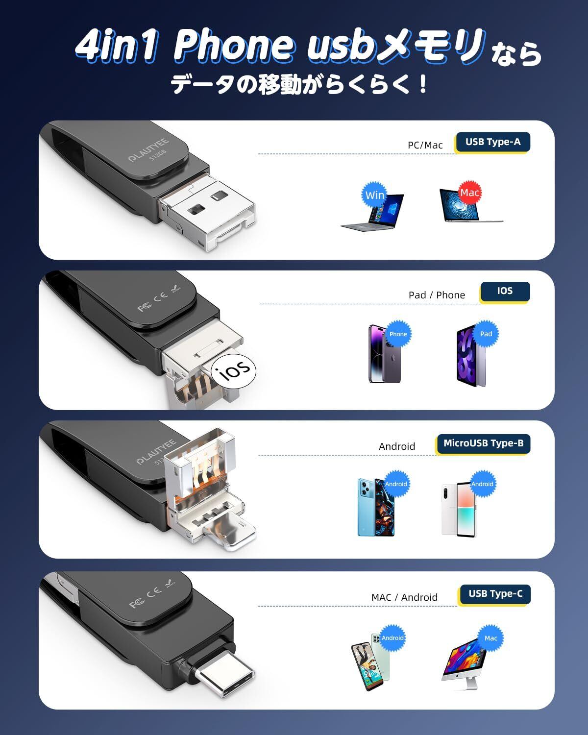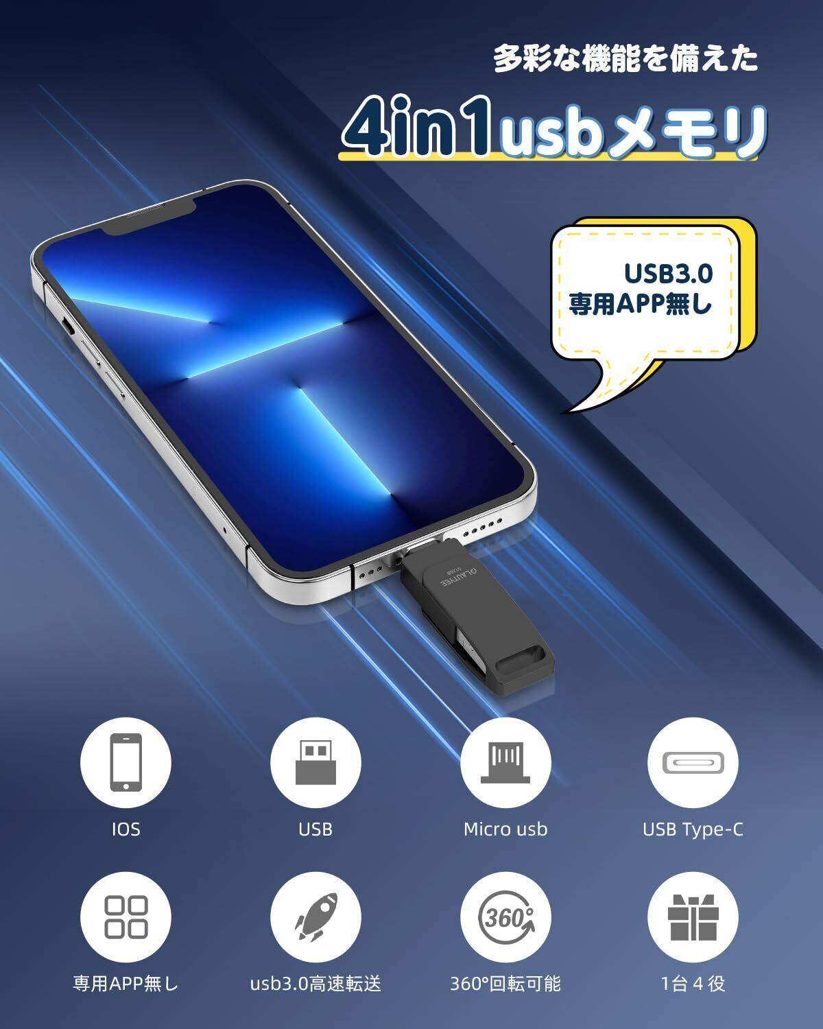 【業界初 アプリ不要!】この革新的なUSBメモリは、業界で初めて完全なAPP不要設計を実現しました!専用アプリや面倒な設定は一切不要。PhoneやAndroidに接続するだけで自動的に認識されます、すぐにデータの保存・転送が可能です。また、オペレーティング システムが Windows、macOS、Android のいずれであっても、どのデバイスでもシームレスに実行されます。【次世代4in1 多機能USBメモリ】転換アダプター不要の革新的設計!煩わしいアダプターの持ち運びから解放!1台でTypeC端子・IOS端子・USB端子・microUSB端子を備えており、 PCとスマートフォン間のデータのやり取りが自由自在。