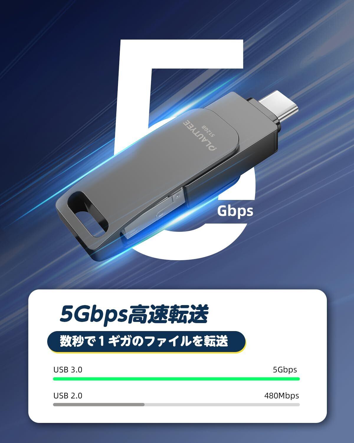 【スマホの容量不足解消!】スマホの容量不足でお困りではありませんか?写真や動画を撮りすぎて「ストレージがいっぱいです」と表示される…大切なデータを消さないといけない…アプリの動作が重くてイライラする…そんな悩みをこのusbメモリーが解決します!スマホ内の写真・動画・音楽・アプリデータをまとめて移動可能!ストレージを大幅に空けて、スマホの動作を軽快に。面倒なケーブルやパソコン不要!Androidスマホに差すだけで、簡単にデータ転送・バックアップ可能。【超高速5Gbpsデータ転送】このusbはUSB 3.0規格に対応し、最大5Gbps(USB 2.0の約10倍)の超高速転送が可能。大容量ファイルも瞬時にやり取りでき、HD画質の映画でさえわずか数秒での転送を実現します。