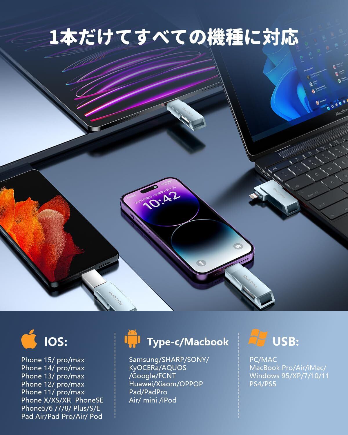 【多機種対応】Lightning、USB-A、USB-Cなど複数端子に対応し、iPhone・iPadはもちろん、MacBook、Windows PC、Androidタブレットなど多機種で使用可能です。機種変更をしても使い続けられるため、長期的なデータ運用にも最適。写真、動画、音楽、ドキュメントなど、ほぼすべての一般的なファイル形式に対応し、OSを越えてファイル共有が簡単に行えます。高い互換性と柔軟性を備えた1本で、仕事・プライベート・学習用途まで幅広いシーンで活躍する万能iphone用外付けメモリです。