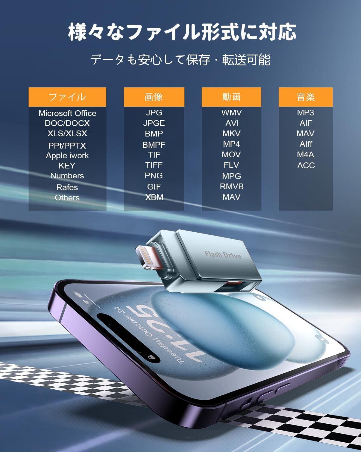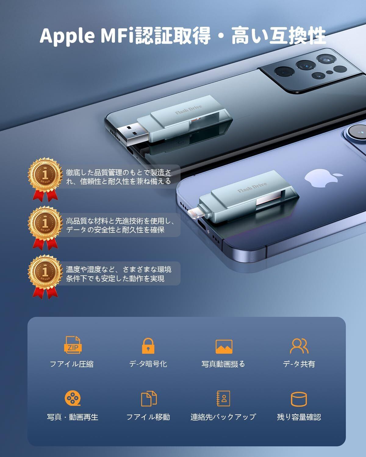 【APPLE MFi認証取得】本品はApple社の厳格な審査を通過したMFi正式認証品です。純正認証チップを内蔵しており、iOSアップデートにも安心して対応し、iPhone・iPadとの接続時に互換性エラーが出る心配がありません。純正基準に沿った安定した電力供給と信号伝送により、データ読み込み・書き込み時の不具合を大幅に低減。大切な写真や動画を扱う外部ストレージだからこそ、信頼できるMFi品質は必須です。スマホ容量不足やバックアップ用途に最適な、安全性・安定性を兼ね備えたUSBメモリです。