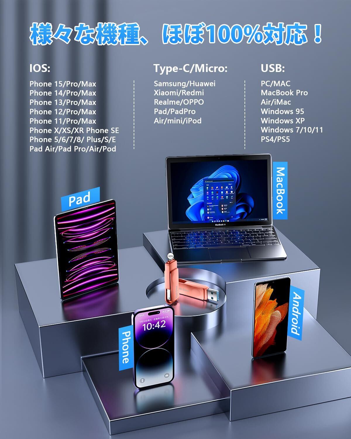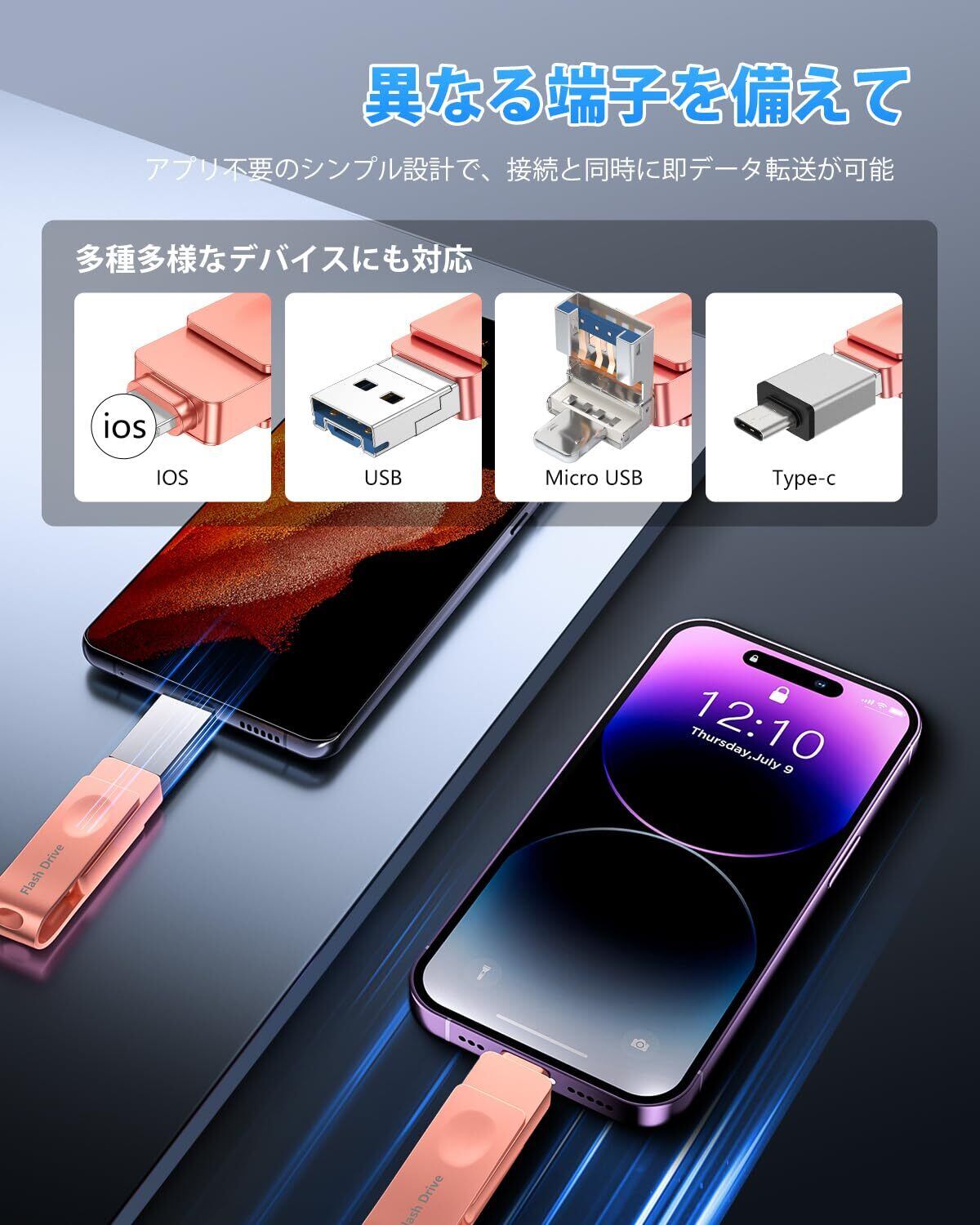 【4in1・多機能usbメモリー】USBメモリはiOS、Type-C、USB、Micro USBの四つのコネクタを搭載し、Phone、iPad、パソコンからテレビやプリンターまで、ほとんどの機種と互換性があります。アプリ不要のUSBメモリをご利用いただき、スマホの容量不足を解消できて、写真保存・データ保存の機能も果たすことができて、データ移行、データ管理、ファイル移動、データ共有やファイル圧縮などの機能も搭載されます。
