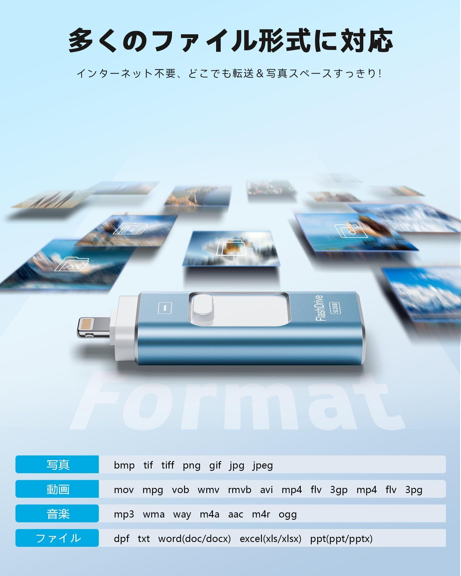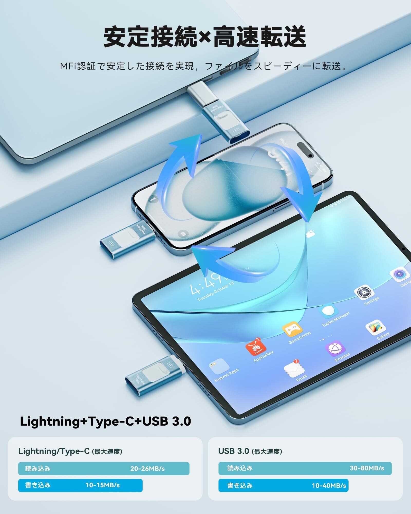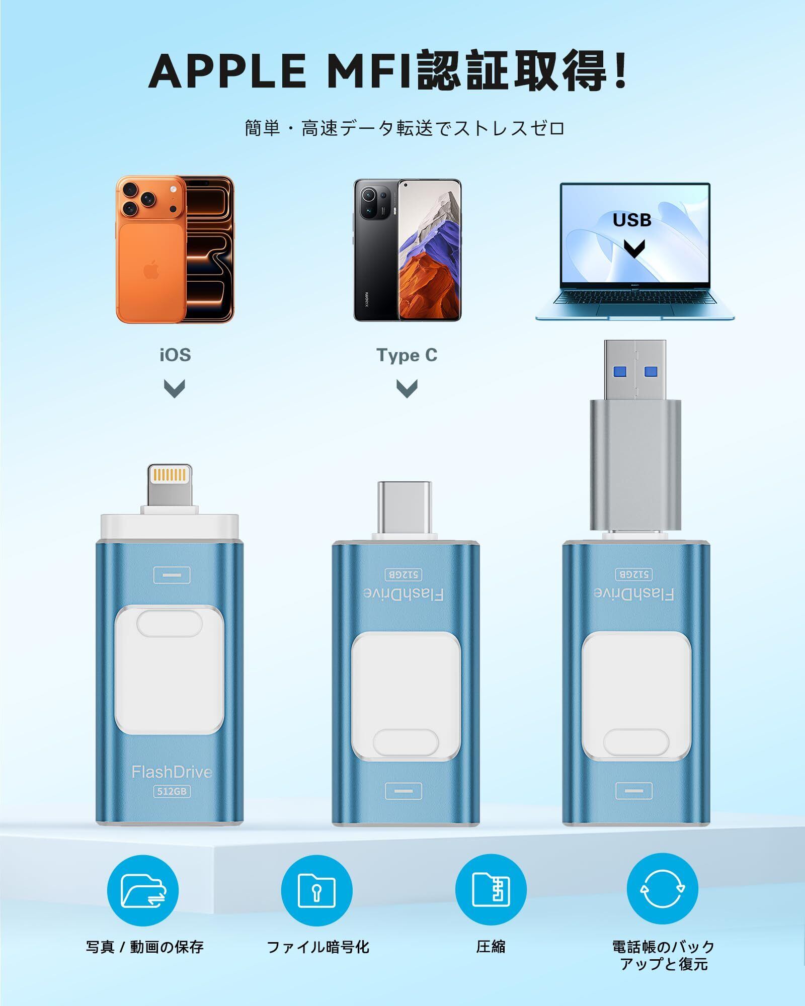【多機種対応 usbメモリ iphone】 本USBメモリは、iOS/USB/Type-C/USB 3.0の3種類の接続端子を搭載しており、PC・Android・MacBook・iPhone・iPad機器で手軽にデータをバックアップできます。 iPhone 17 / 17 Air / 17 Pro / 17 Pro Max / iPhone 16 Pro Max / 16 Pro / 16 Plus / iPhone 16 / 15 Pro Max / 15 Pro / 15 Plus / 15 / 14 Pro Max / 14 Pro / 14 Plus / 14 / SE3 / 13シリーズ / 12シリーズ / 11シリーズ / XR / XS / X / 8 / SE2、iPad Air(第1〜3世代)、iPad mini(第1〜5世代)、iPad(第5〜9世代)、MacBook(Pro/Air)、各種Androidスマホやタブレットなど幅広いデバイスと互換性があります。