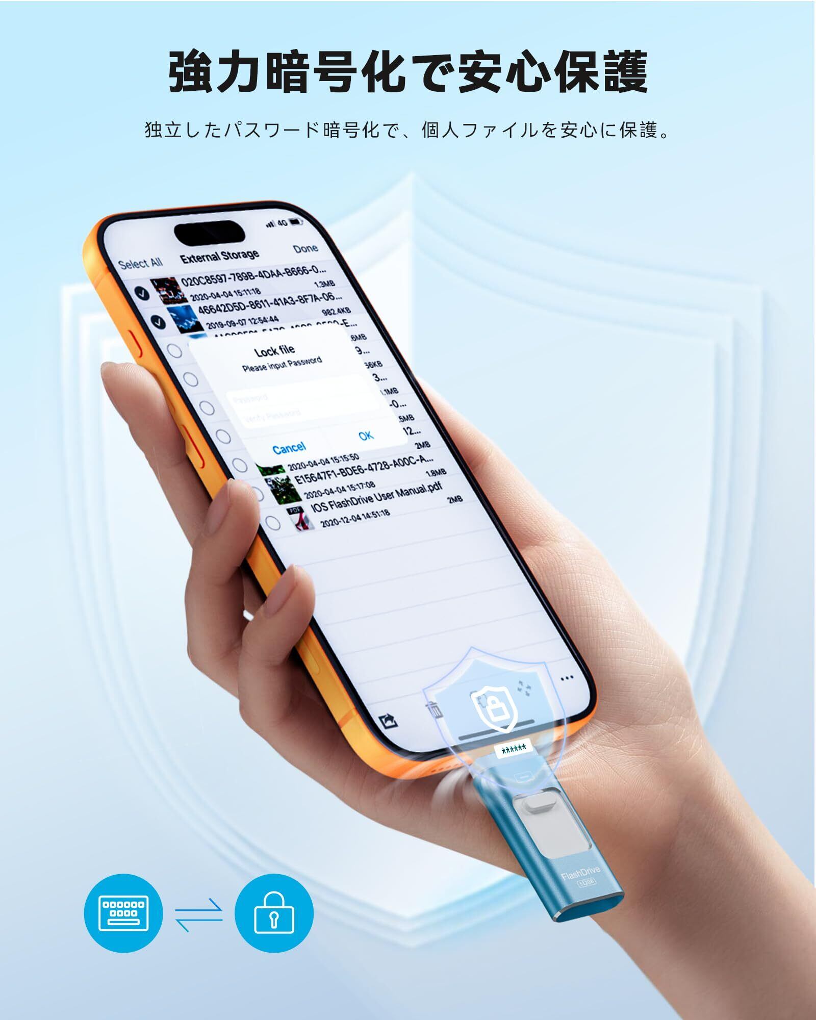【専用アプリでプライバシー徹底保護】 Apple公式MFi認定の128GB iPhone用 usb メモリは、最新のデータ暗号化技術を採用。専用アプリ「ROSPE」でパスワードやTouch IDを設定すれば、個人データをしっかり守り、万が一の紛失時でも安心です。 写真・動画・連絡先など、大切な情報をあなたの手の中で安全に管理。プライバシーを重視するユーザーに最適な一本です。 ※iOS専用機能のため、一部のセキュリティ機能はAndroid端末ではご利用いただけません。