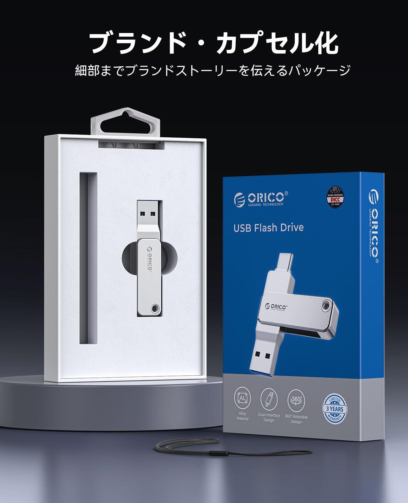 ORICO USBメモリ 128GB -スマートフォンやノートパソコン向けに設計された超薄型製品で、回転式 USB 3.2 高速 最大読出速度150MB/s 金属製 軽量&耐久性、3年間のメーカー - EB05