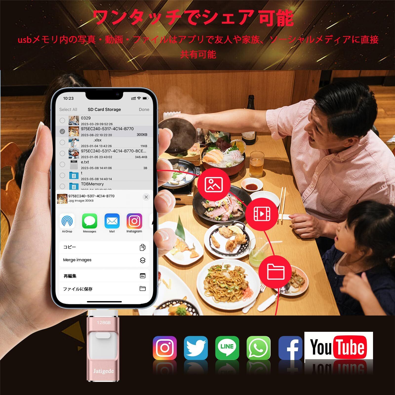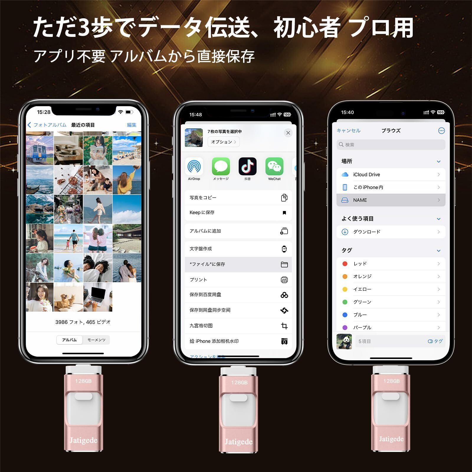 【4in1 多機種対応・専用アプリ必要なし、安心安全usbメモリ】当社のusbメモリは専用アプリ必要なくて、Ap社の「ファイル」を使用して、phone データ直接保存可能です。他社の専用アプリ必要usbメモリに比べて、アプリのダウンロードの邪魔がなくて、phone・iPadのデータが直接バックアップ可能、もっと便利、安心安全!さらに、IOS・USB-A・USB-C端子が4 IN 1で、幅広いデバイスを対応可能で、データ転送、phone・iPad容量不足、簡単に解消出来ます。