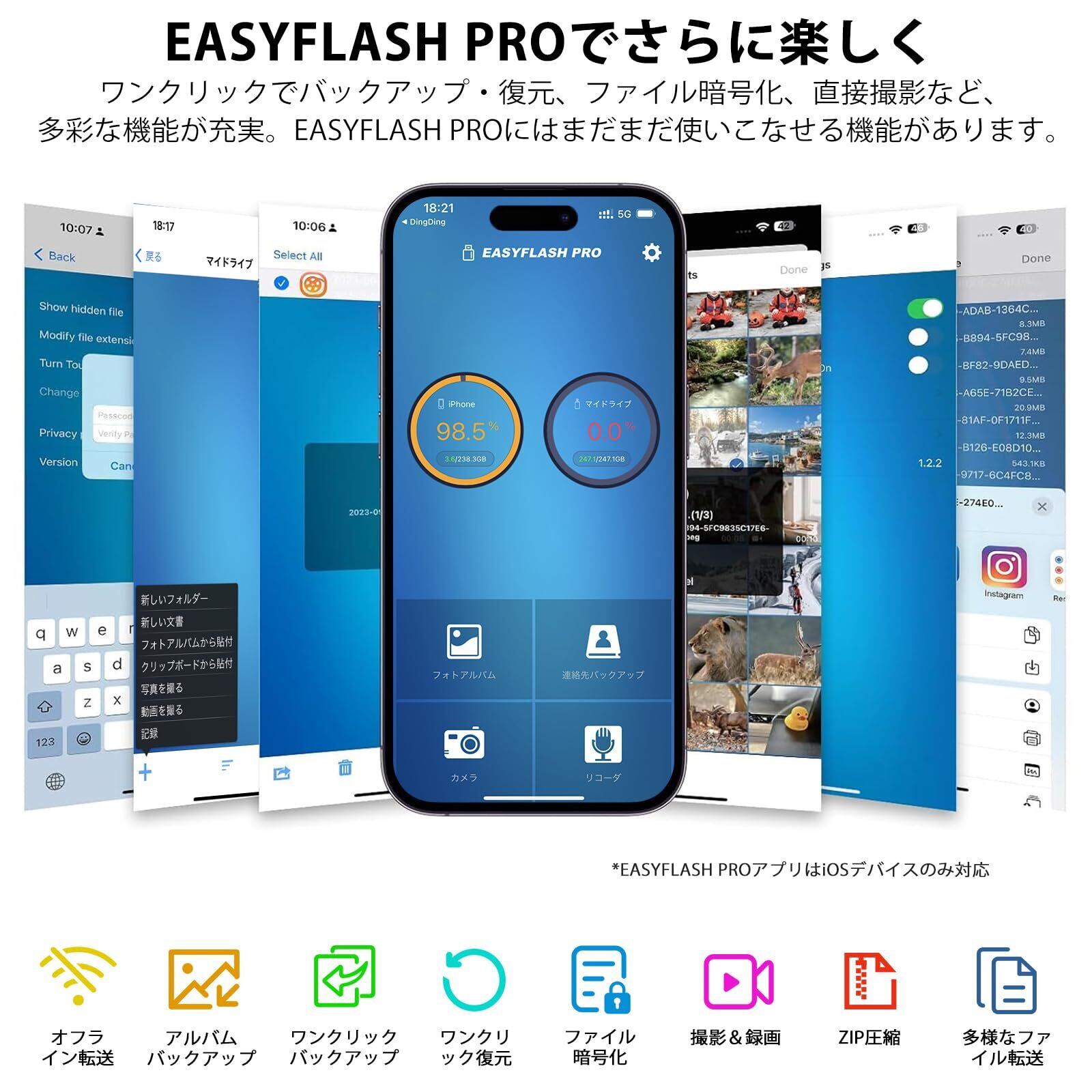 【専用アプリでプライバシー徹底保護】 iOS専用アプリ「easyflash pro」に対応。専用アプリによるデータ暗号化で、USBを紛失しても大切なデータが漏れる心配はありません。写真・動画・連絡先をワンクリックでバックアップ可能。ファイル閲覧・整理・暗号化保存もでき、スマホ容量不足の解消や旅行写真の保存、急な端末トラブル時のデータ退避にも大活躍。App Storeから無料で今すぐダウンロード可能。