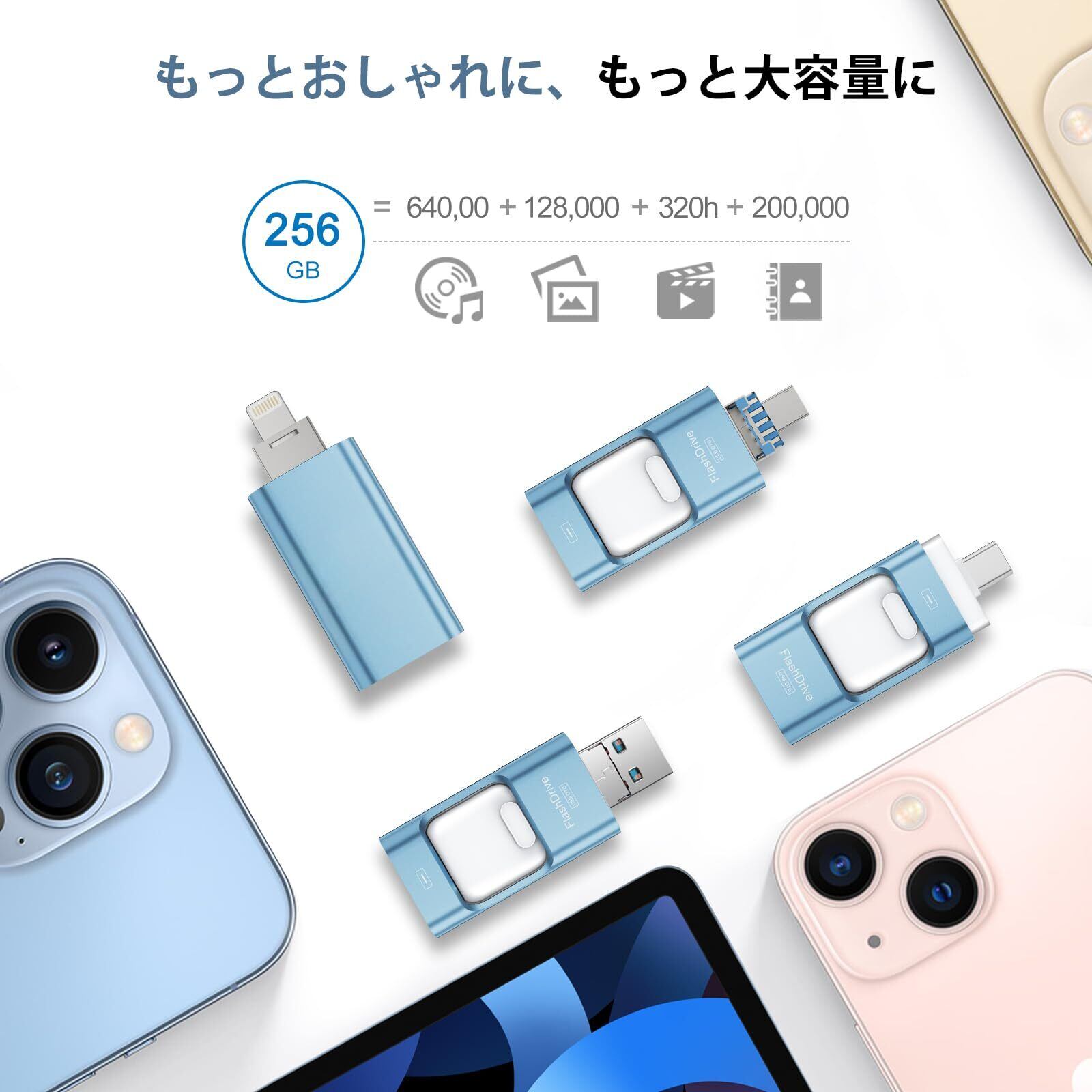 【4in1多機能設計】 Type-C/USBメモリ/Lightning対応 USBメモリー大容量256GBで、Phone(ライトニング対応)・Android(Type-C)・PC(USB-A)・車載機器(Micro USB)にアダプタ不要で直接接続。アルミ合金製メモリースティックで高耐久&コンパクト携帯に最適。