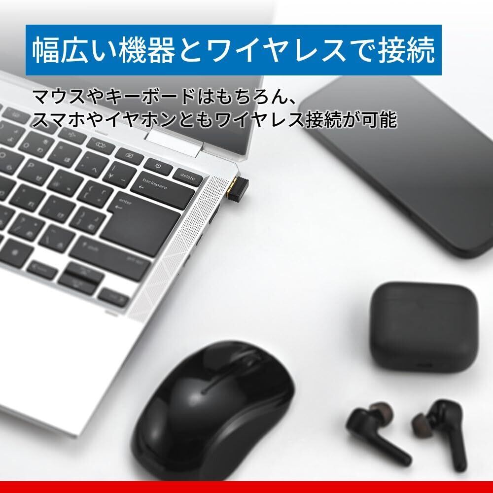 【挿すだけで使えるBluetoothアダプター】Bluetooth5.4に対応。パソコンのUSB Type-Aポートに挿すだけでBluetooth機能を追加できます。ソフトウェアなどのインストールも不要です。※初回接続時はインターネットへの接続が必要です。