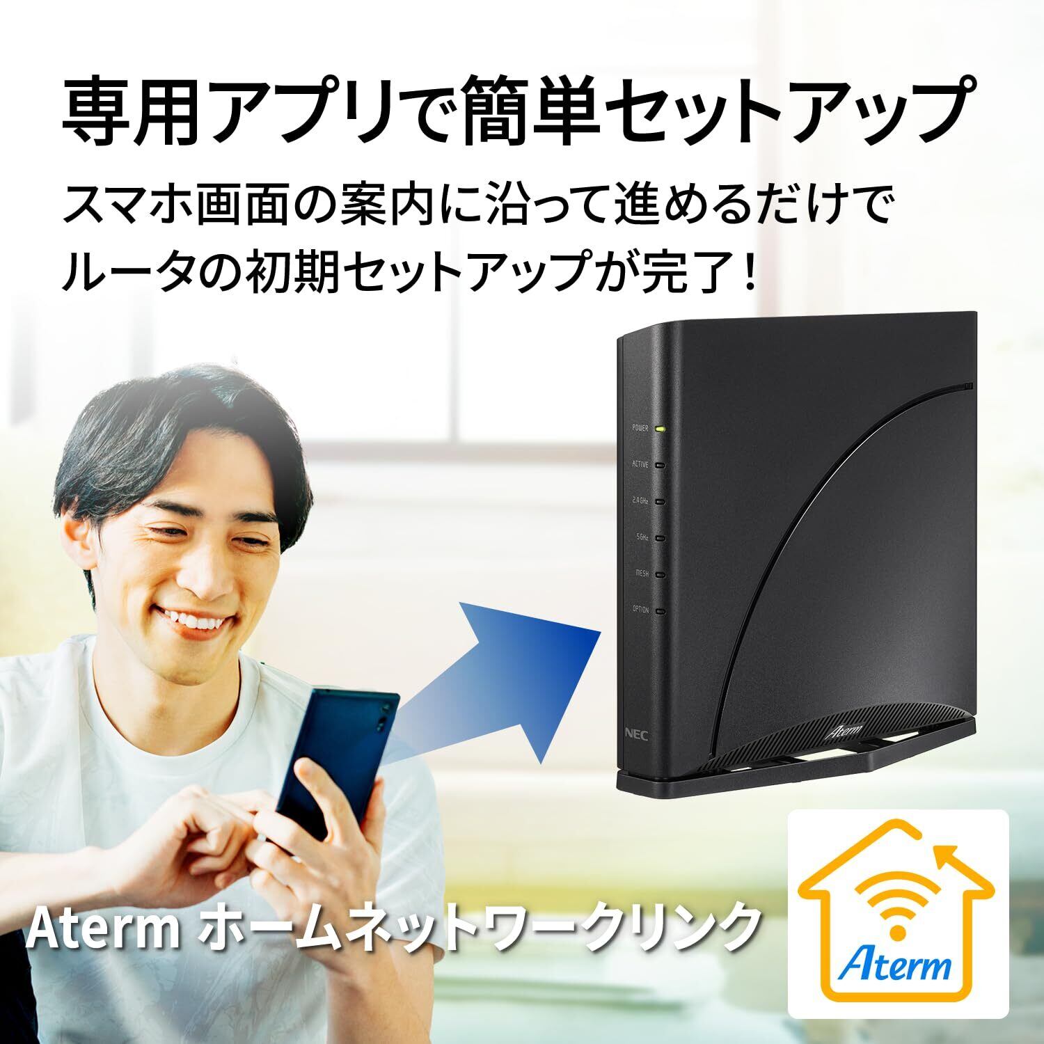 【Aterm ホームネットワークリンクアプリ:初期設定ウィザード機能】スマホの画面の案内に沿って進めるだけでインターネット接続するまでの初期設定ができます。