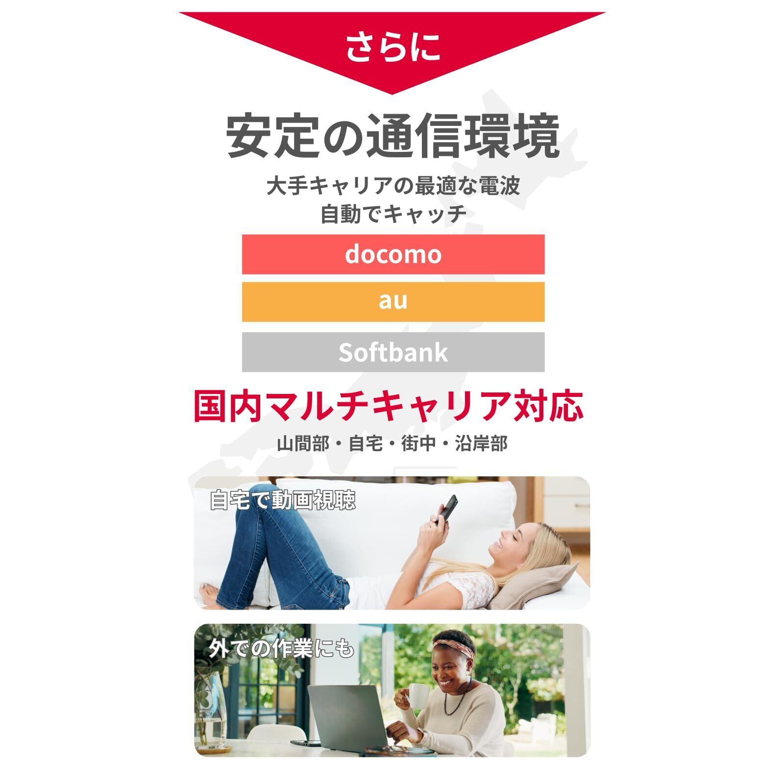【回線】大手マルチキャリア対応で快適接続(docomo回線・au回線・Softbank回線)