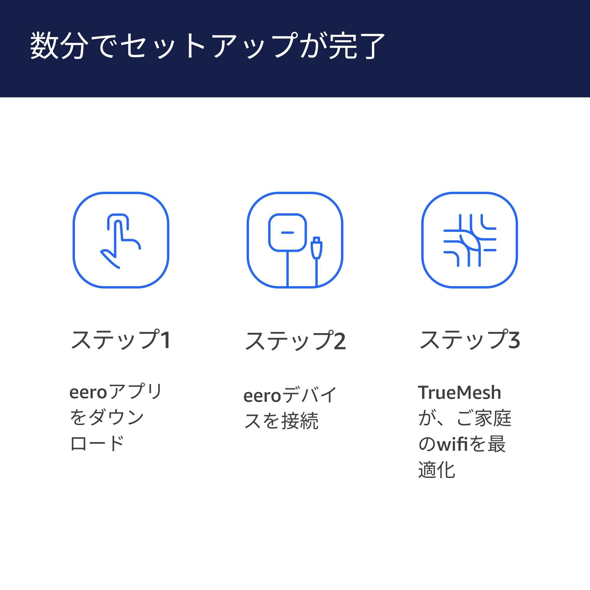 【TrueMeshの安定性】eeroのTrueMeshテクノロジーは、ネットワーク上のトラフィックを能動的に調整し、各接続デバイスを、都度最適なネットワーク経路に誘導。ネットワークの切断を減らし、ご自宅全体でシームレスなwifi環境を実現。